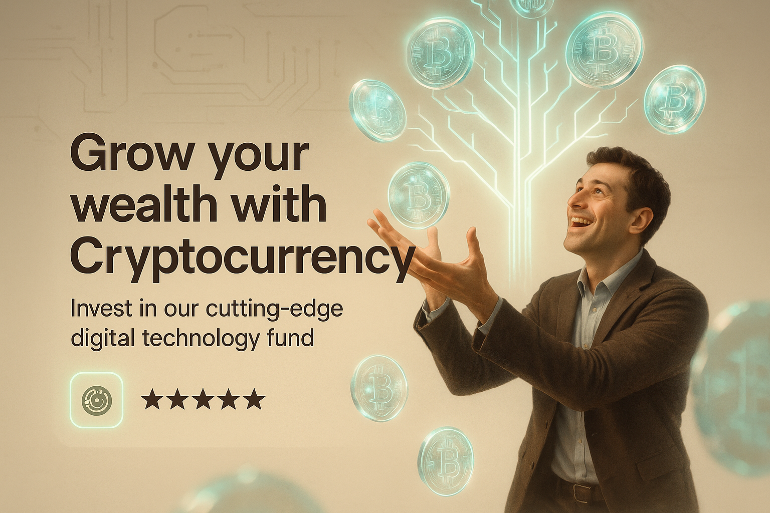 /Collection: /by davooda/Type: PNG/Engaging promotional graphic showcasing a man enthusiastically promoting cryptocurrency investment with digital elements, ideal for financial services marketing.