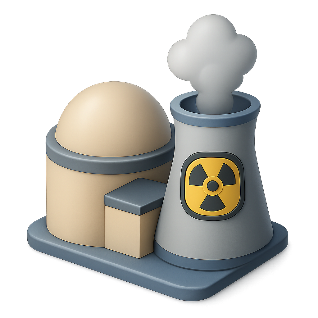 /Collection: /by davooda/Type: PNG/A simple isometric illustration of a nuclear reactor featuring a cylindrical cooling tower, a dome structure, and smoke rising from the tower. The design showcases a three-quarter view with a clean, volumetric feel.