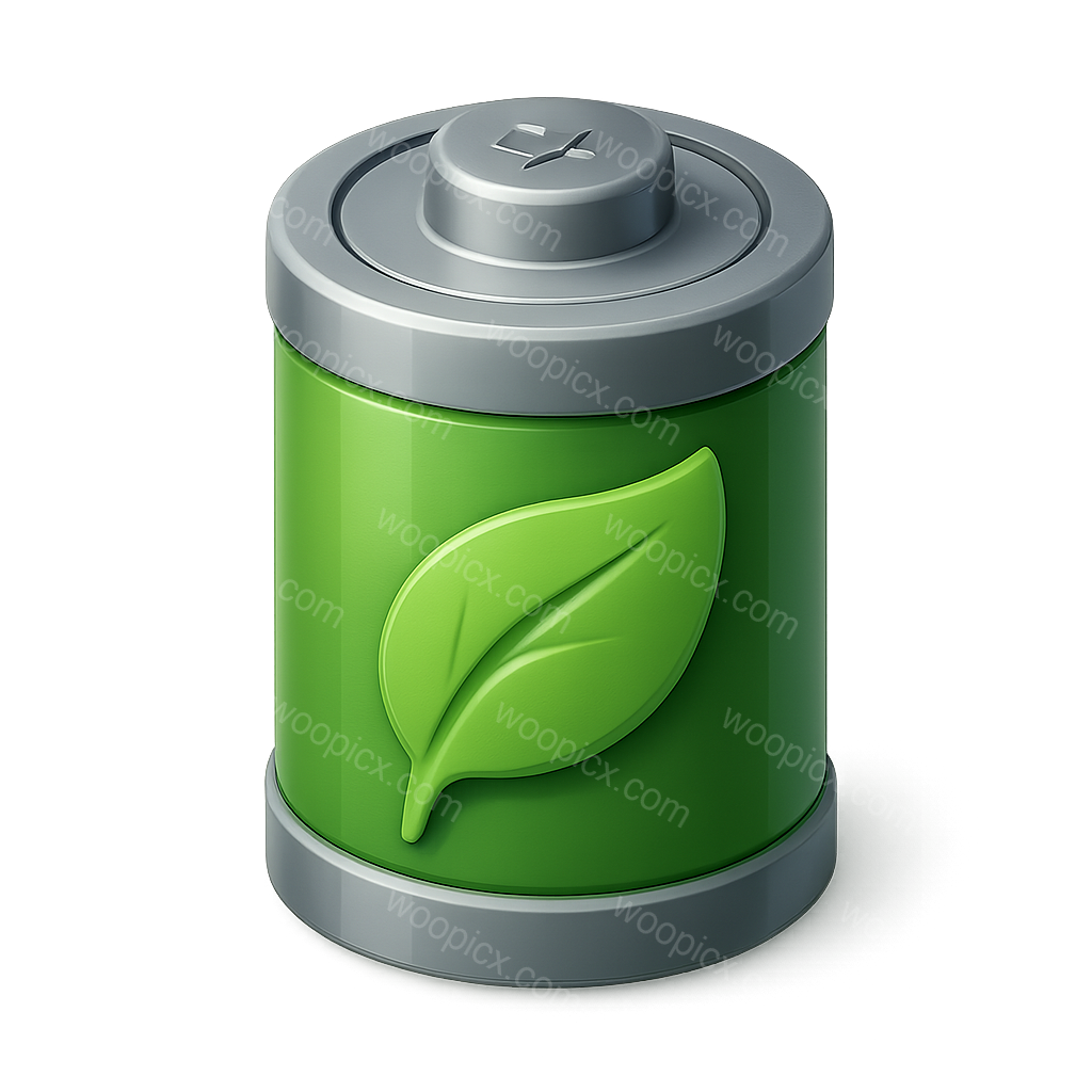 A 3D icon of a battery with a green leaf symbol, representing eco-friendliness. The battery is designed with a sleek, modern look and a transparent background.