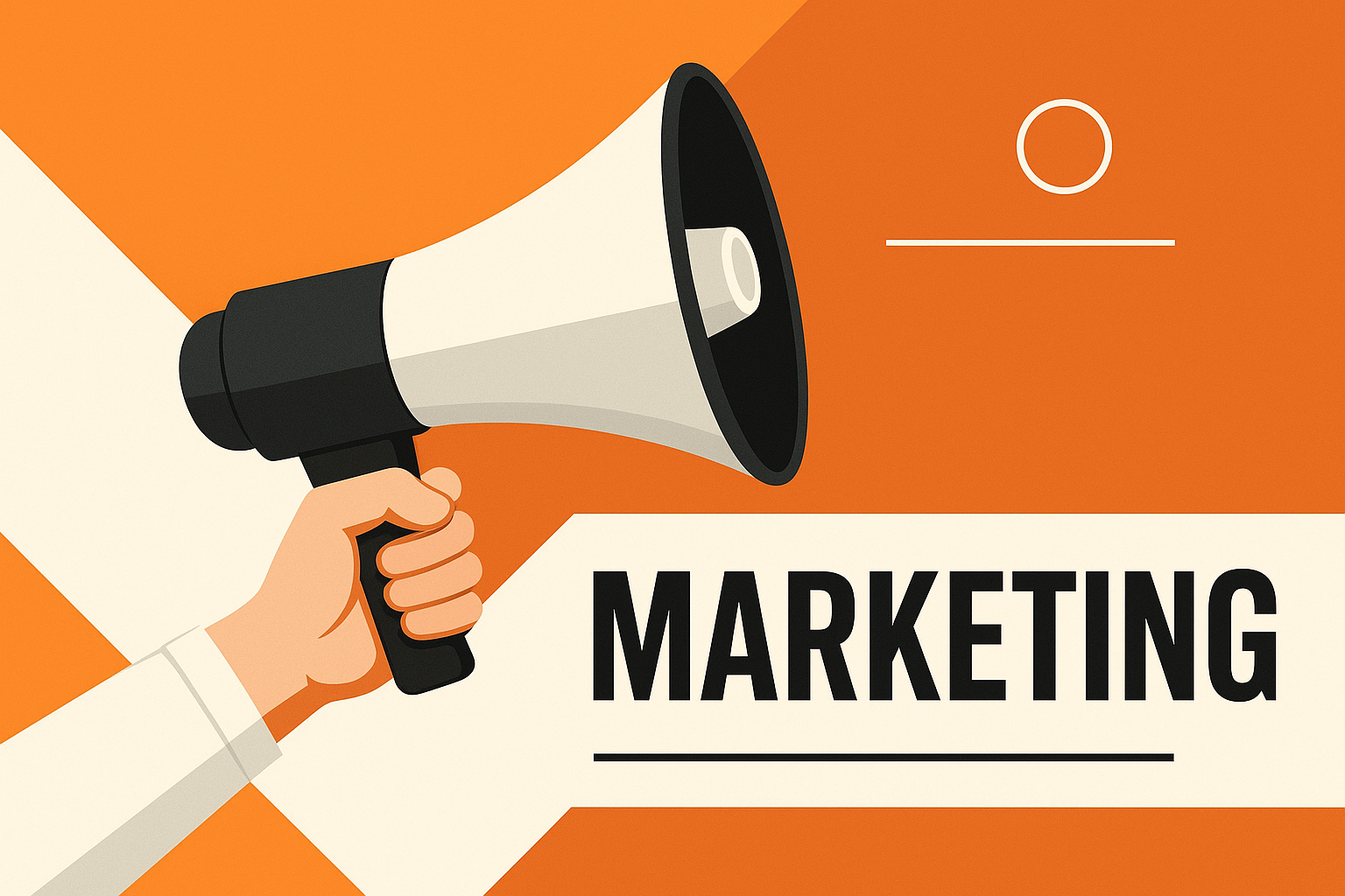 /Collection: /by davooda/Type: PNG/A hand holds a megaphone against an orange background, emphasizing marketing themes. The design features a clean, modern aesthetic with bold typography and structured color blocks.
