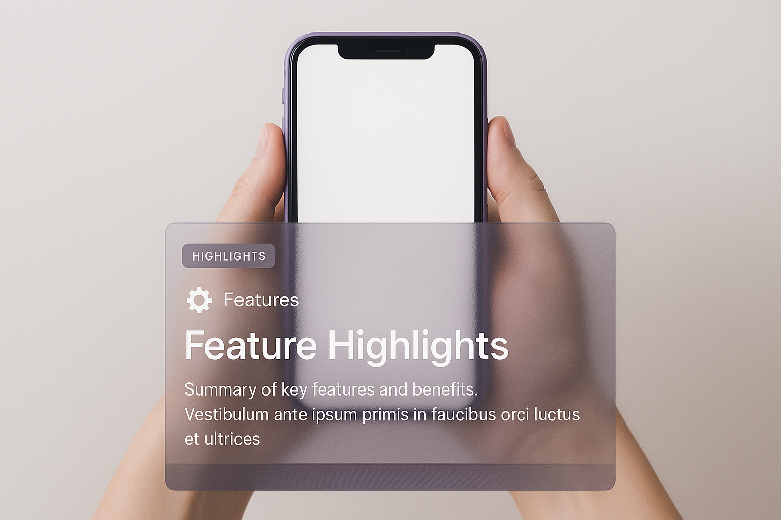 /Collection: /by davooda/Type: PNG/A purple smartphone is held upright between two hands, showcasing a blank screen. A translucent overlay presents feature highlights, enhancing the modern aesthetic.