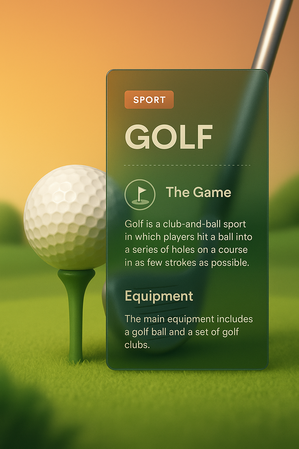 An engaging 3D illustration of golf featuring a golf ball on a tee with a stylish transparent design block that includes text about the game and equipment.