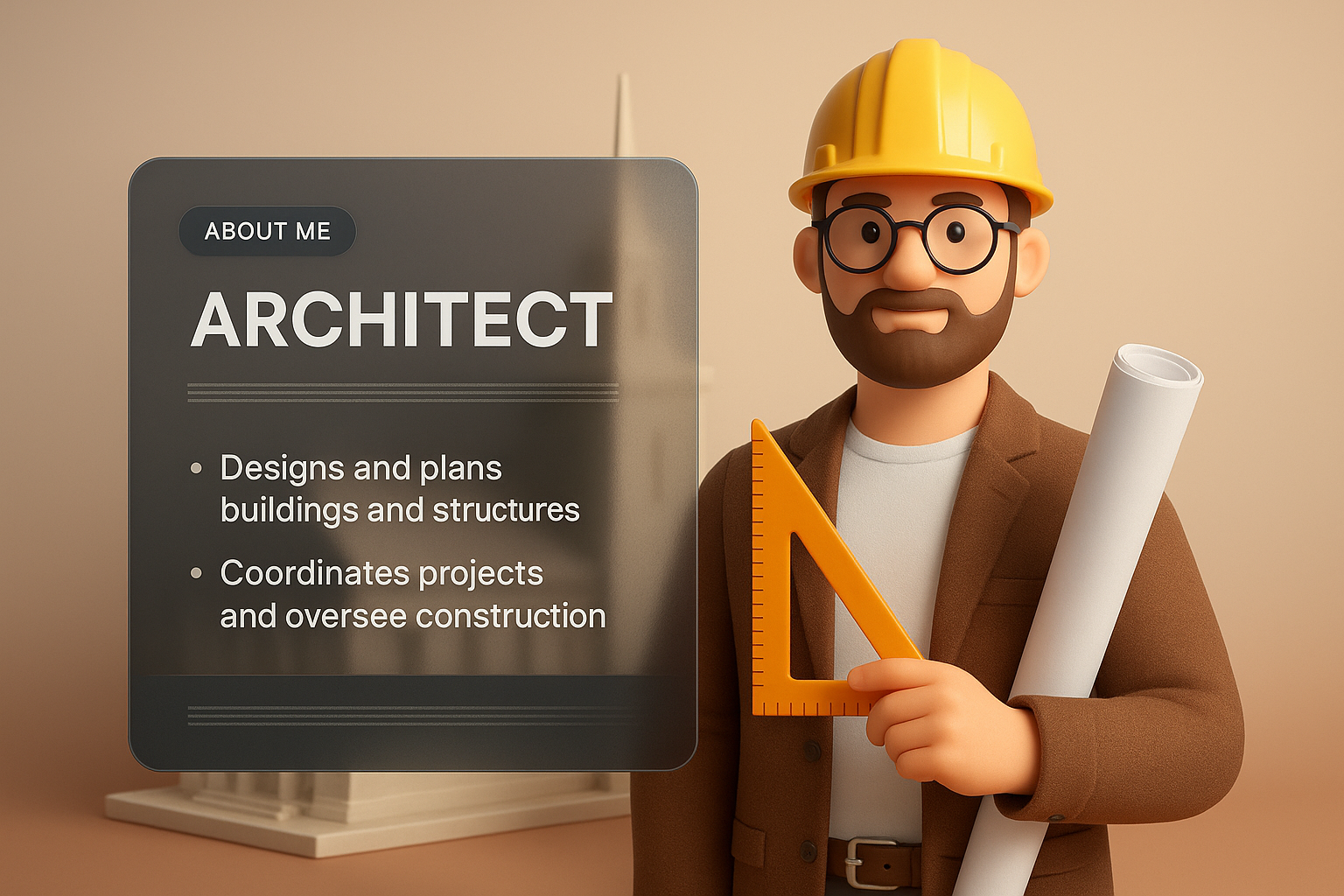 /Collection: /by davooda/Type: PNG/A 3D illustration of an architect holding a ruler and blueprint, accompanied by a stylish dark panel displaying key information about the profession. The background features a smooth gradient.