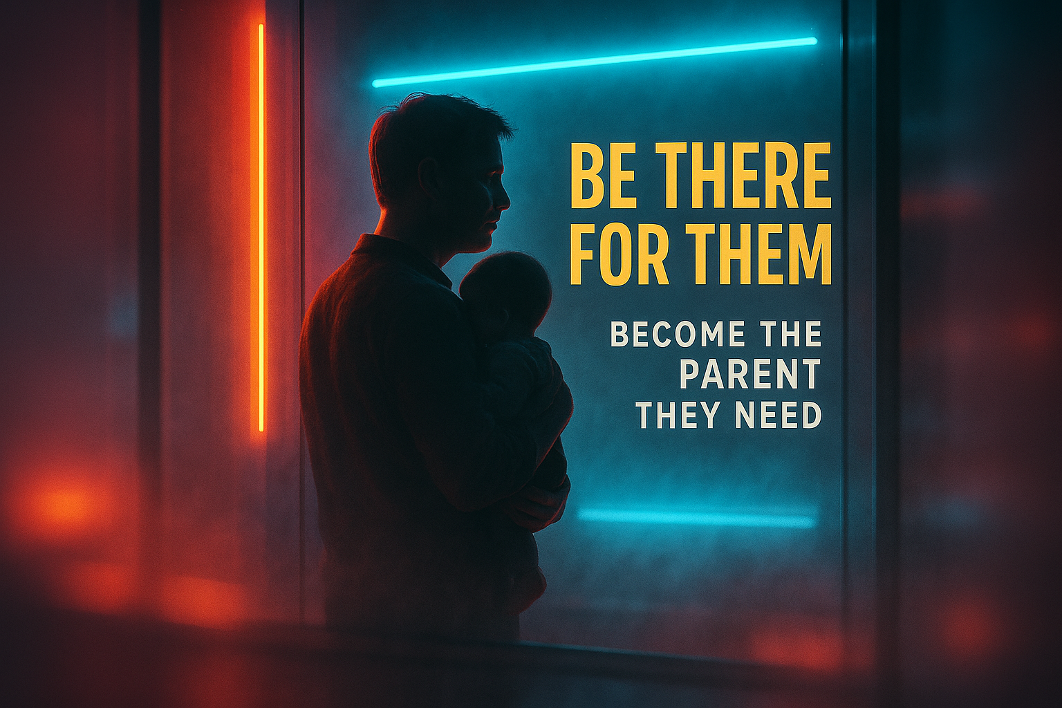A silhouette of a parent holding a child is framed by neon lights, creating a warm yet moody atmosphere. The text encourages parental presence, enhancing the emotional appeal.