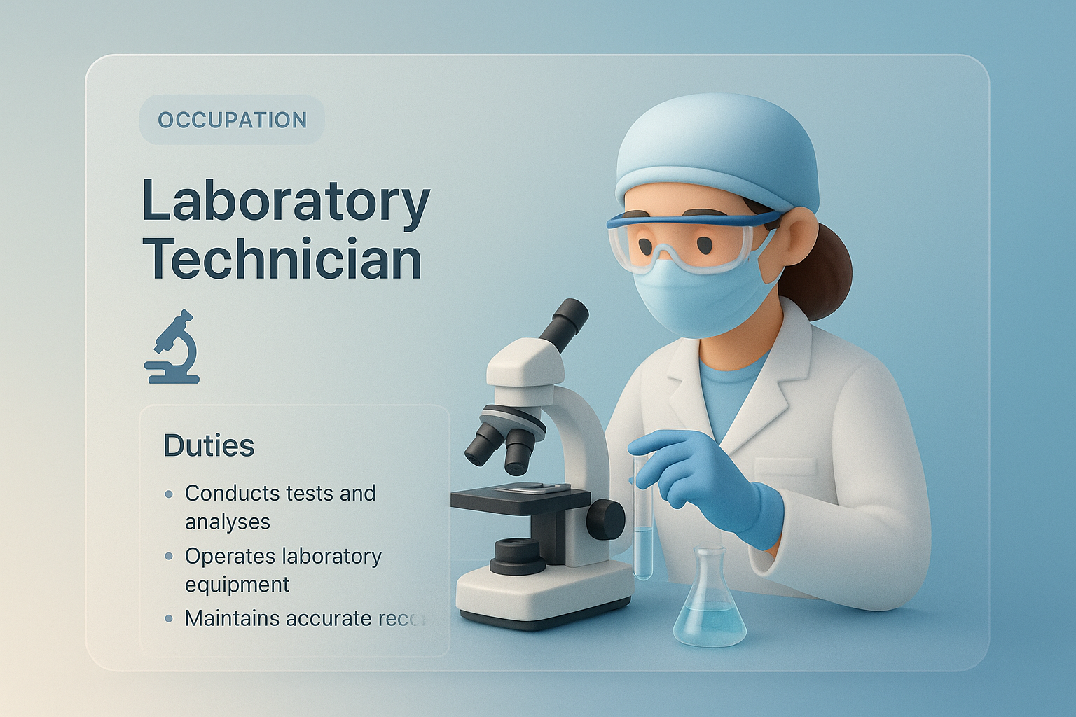A 3D illustration of a laboratory technician in a white coat using a microscope. The design features a light gradient background and clear text detailing the technician's duties.