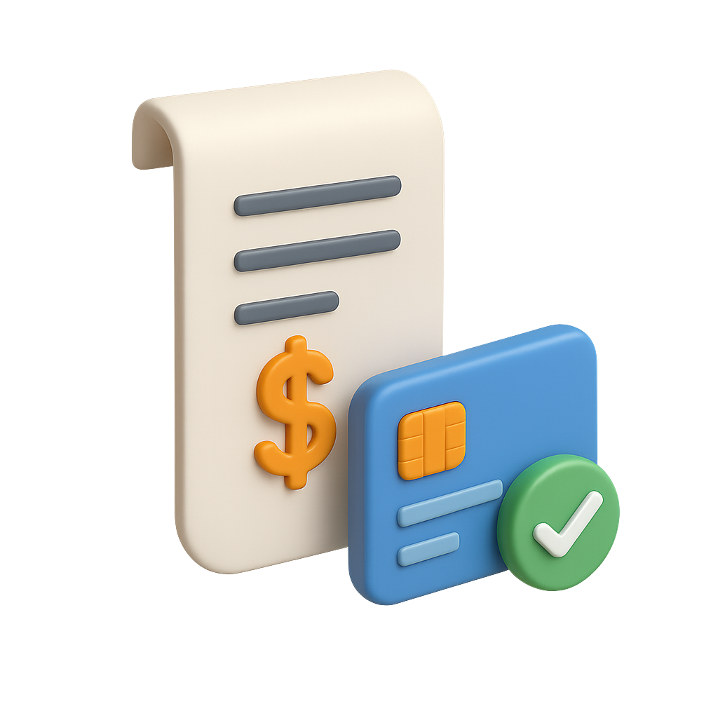 A stylized 3D icon featuring a bill with a dollar sign and a payment card, designed with a three-quarter view and a soft, isometric feel.