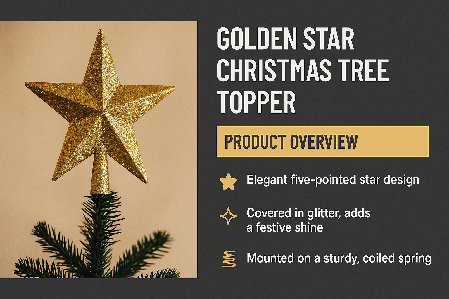 /Collection: /by davooda/Type: PNG/Stylish product overview graphic showcasing a golden star Christmas tree topper. Features a glittery design and sturdy mounting, ideal for holiday marketing.