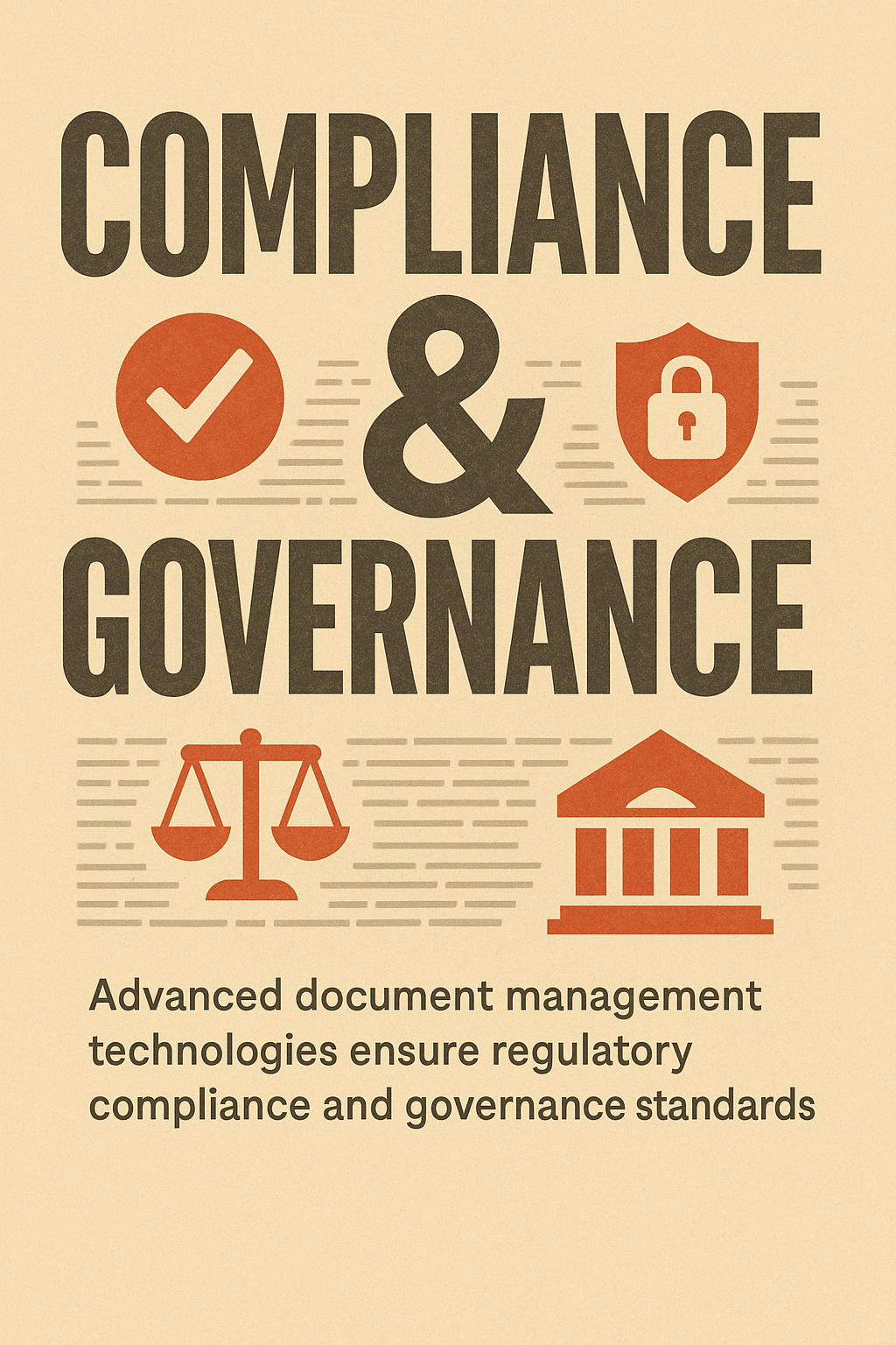 Informative graphic illustrating the themes of compliance and governance with icons representing law and security, suitable for a corporate or legal audience.