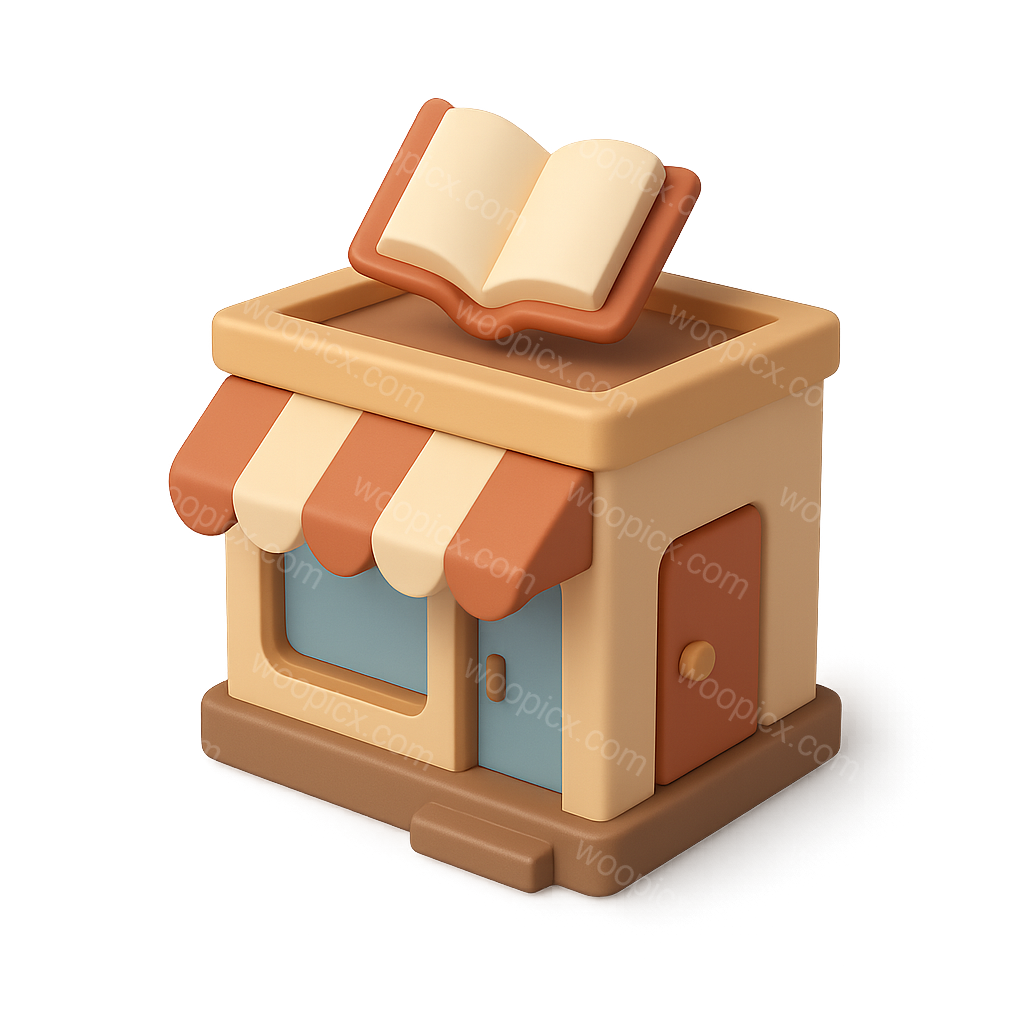 A charming 3D icon of a bookstore featuring a small building with an open book on top. The design is isometric and volumetric, showcasing a welcoming storefront and vibrant colors.
