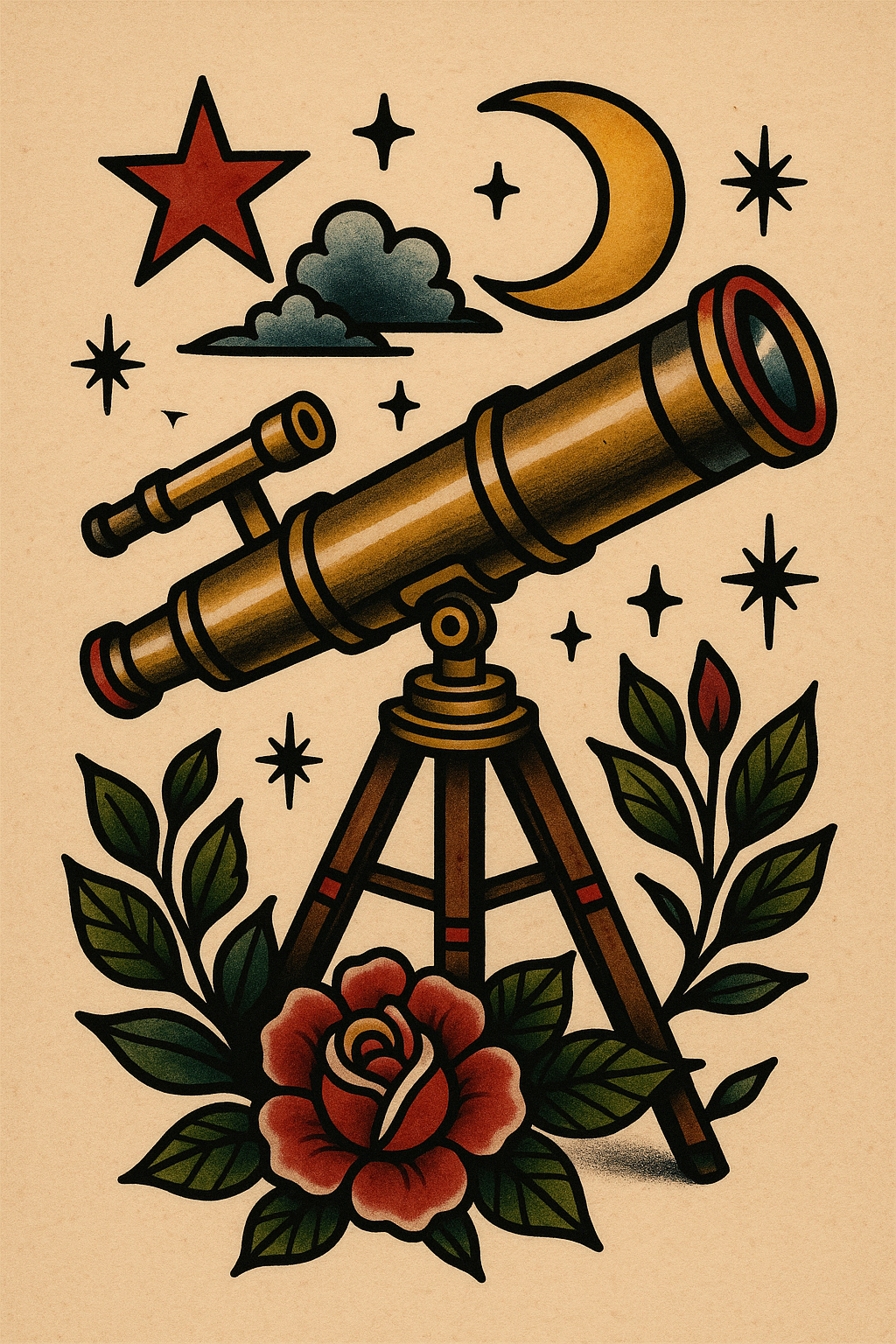 /Collection: /by davooda/Type: PNG/This image features a vintage-style illustration of a telescope surrounded by celestial elements like a moon, stars, and clouds. Ideal for astronomy-themed art or decor.