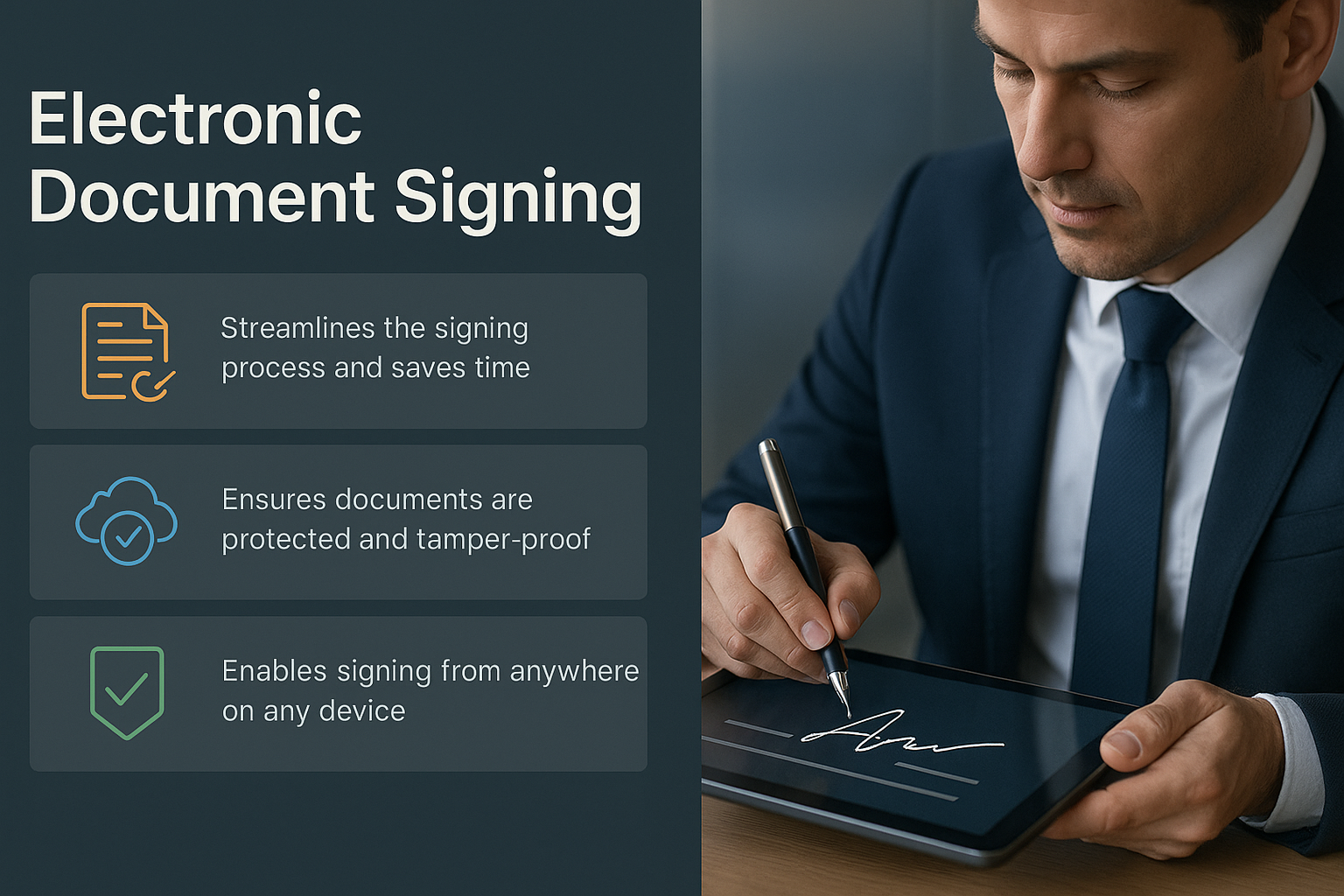 /Collection: /by davooda/Type: PNG/Modern promotional graphic showcasing electronic document signing features with a business professional using a tablet. Ideal for marketing digital signing solutions.