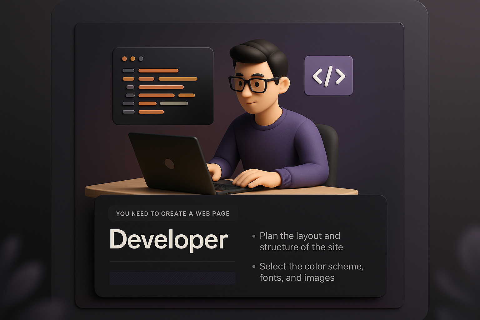 /Collection: /by davooda/Type: PNG/A stylized 3D illustration of a developer working on a laptop, focusing on web page creation. The design features a dark background with text blocks and coding elements.