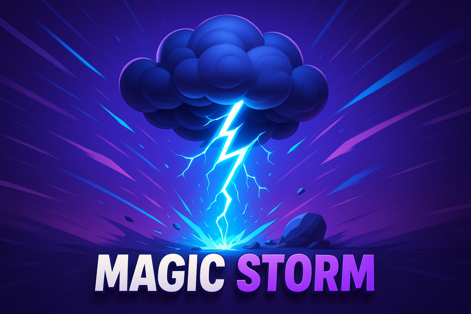 A vibrant, dynamic illustration of a magic storm featuring a dark cloud and a striking lightning bolt. The title 'MAGIC STORM' is prominently displayed in bold, engaging typography.