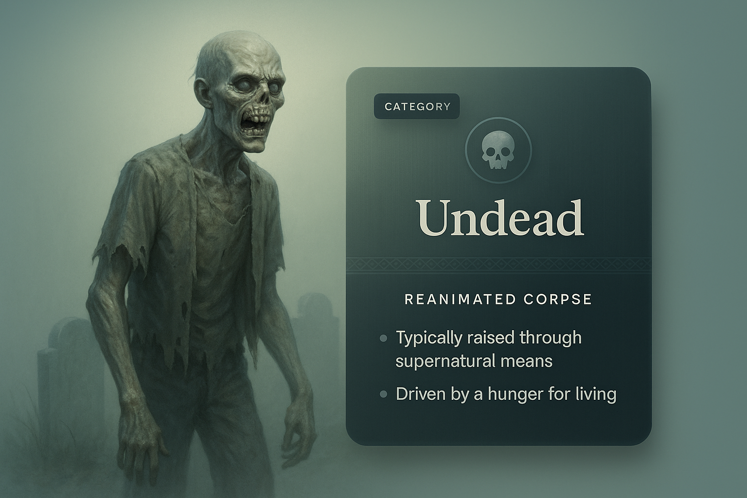 A haunting 3D illustration of an undead figure in a graveyard, with a dark atmospheric backdrop. The image features an informational panel with a cohesive design.