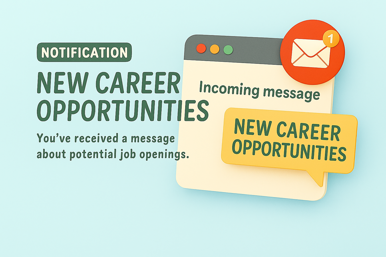 Vibrant graphic designed to notify users about new career opportunities, featuring a message window with playful elements suitable for job-related platforms.