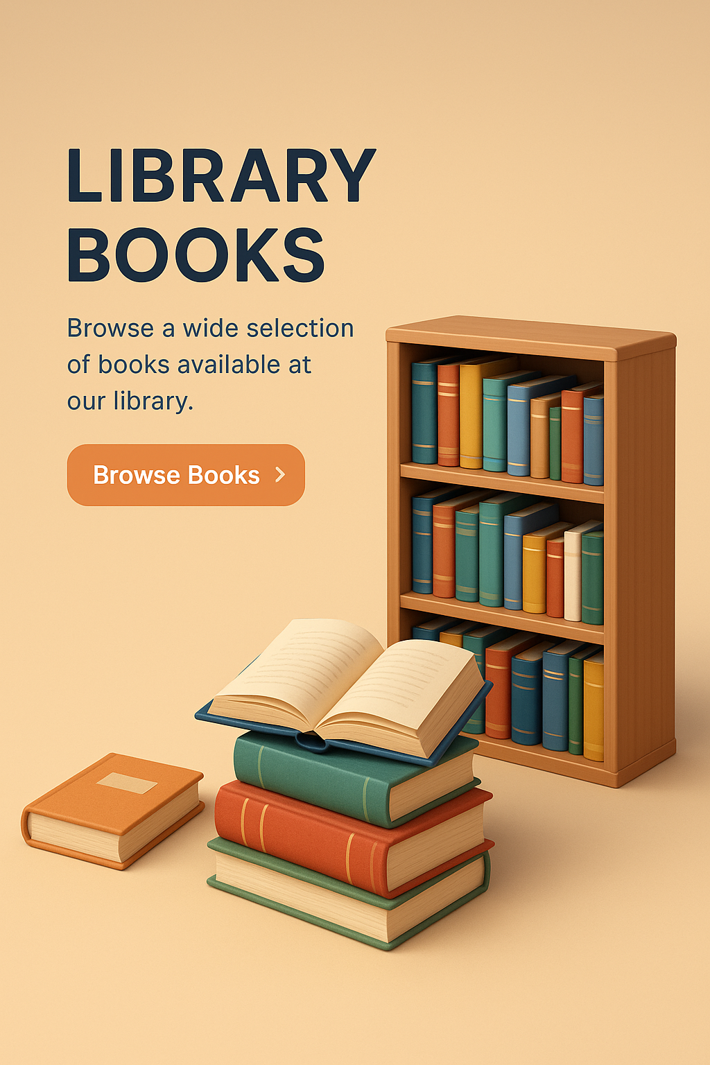 /Collection: /by davooda/Type: PNG/A detailed 3D illustration showcasing a library scene with a bookshelf, stacked books, and an inviting action button. The design features a smooth gradient background and clear text elements.