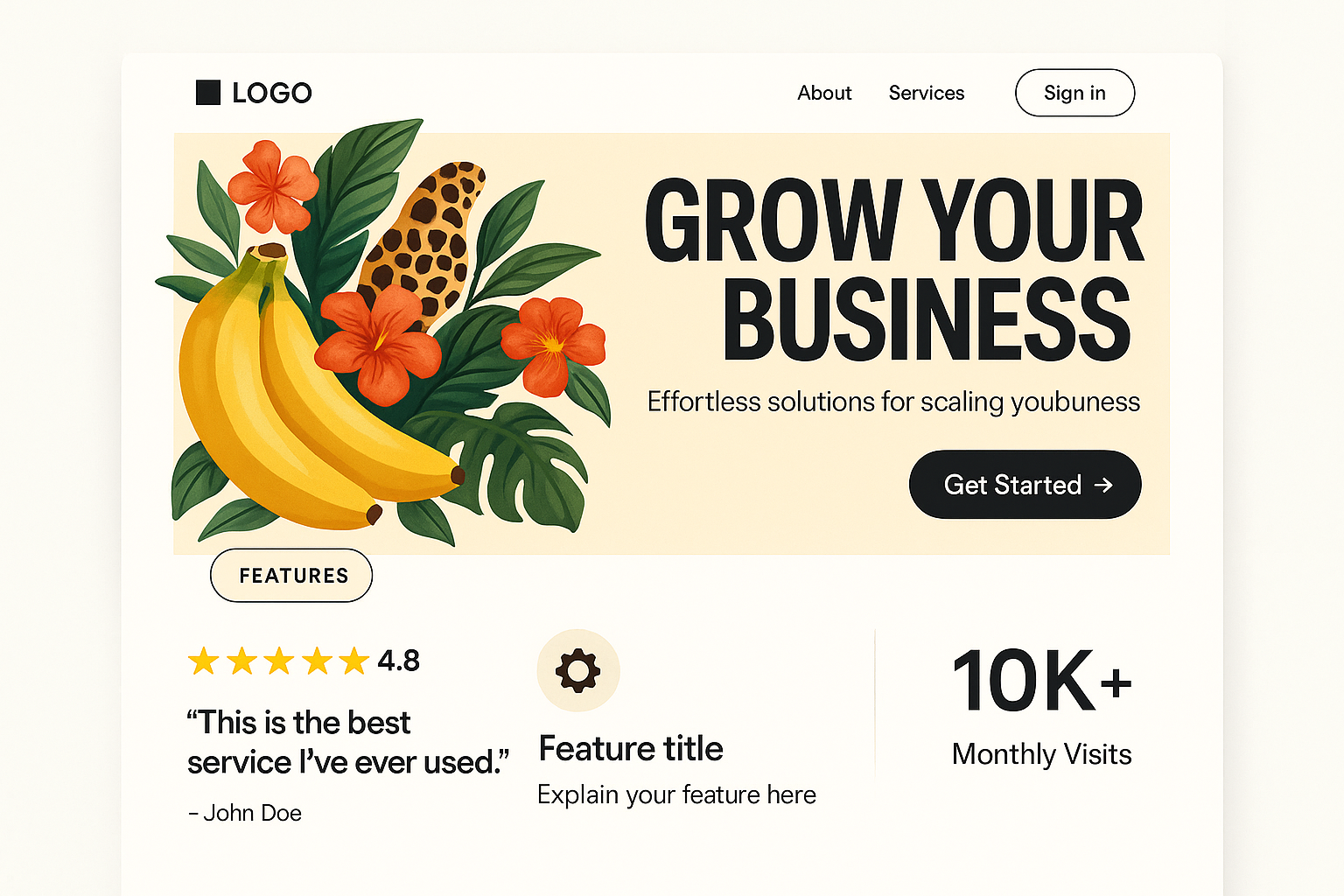 A vibrant landing page design featuring tropical flowers, bananas, and leopard spots. The layout combines bold typography with a modern, minimalistic aesthetic.