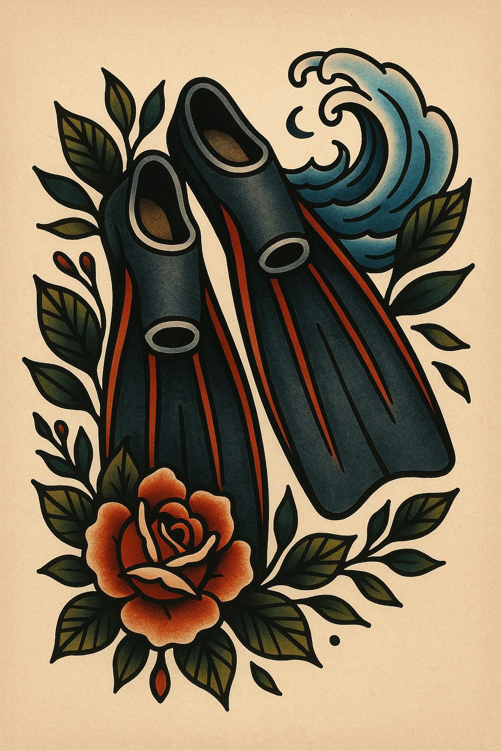/Collection: /by davooda/Type: PNG/This image features a vibrant illustration of flippers and roses, styled in a tattoo-like aesthetic. It is suitable for art prints, merchandise, or social media content aimed at ocean lovers and divers.