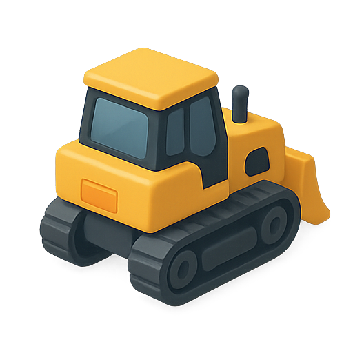 A vibrant 3D cartoon-style bulldozer icon featuring a bright yellow exterior and black tracks. This graphic is ideal for construction-themed apps or educational materials.