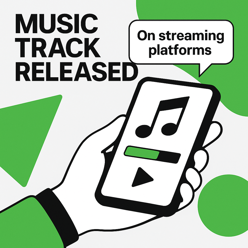 /Collection: /by davooda/Type: PNG/A vibrant social media post announcing the release of a music track, featuring a hand holding a smartphone with a play button. Ideal for music promotion on digital platforms.