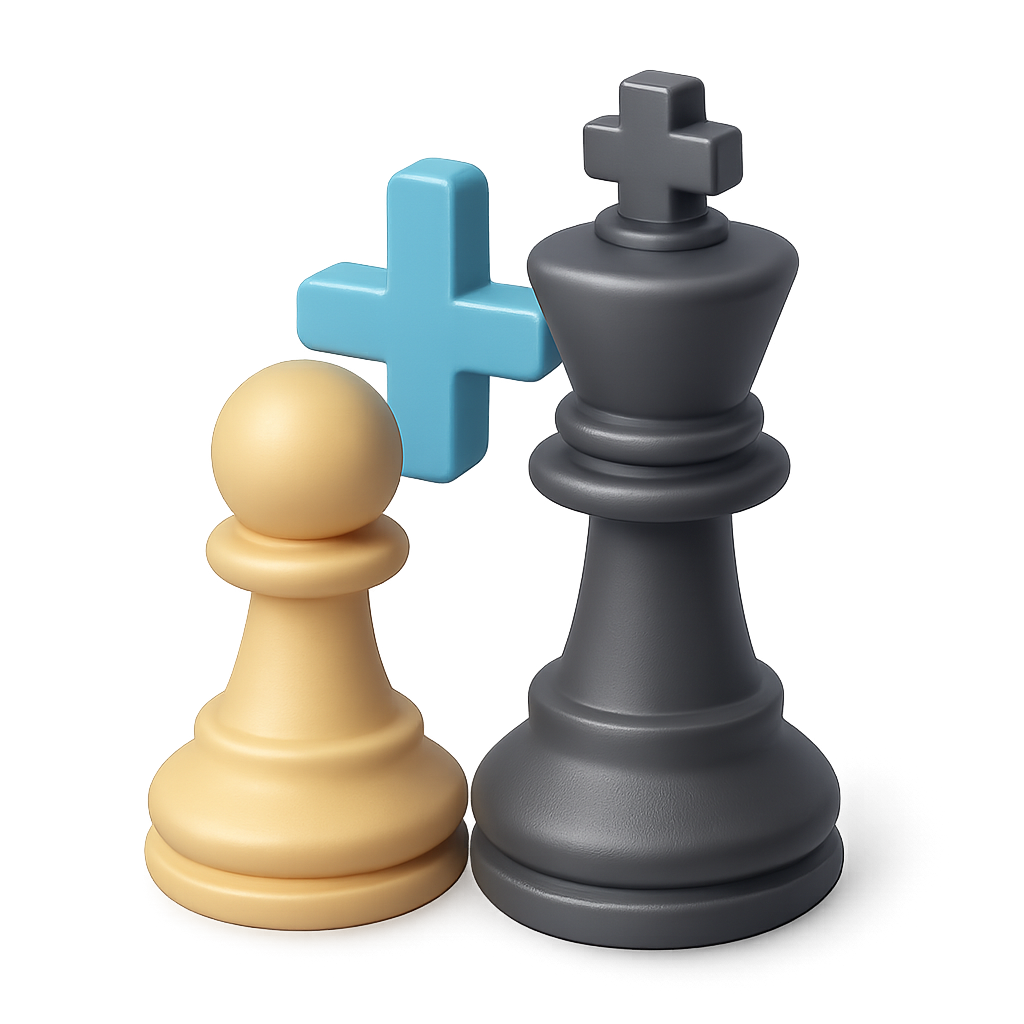 This image features two stylized chess pieces, a pawn and a king, rendered in 3D with a transparent background. The pieces are presented in a three-quarter isometric view, showcasing their volumetric design.