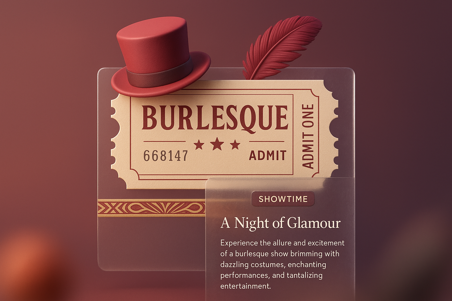 A visually striking 3D design of a burlesque ticket featuring a top hat and feather. The layered composition includes a smooth gradient background, enhancing the ticket's glamorous appeal.