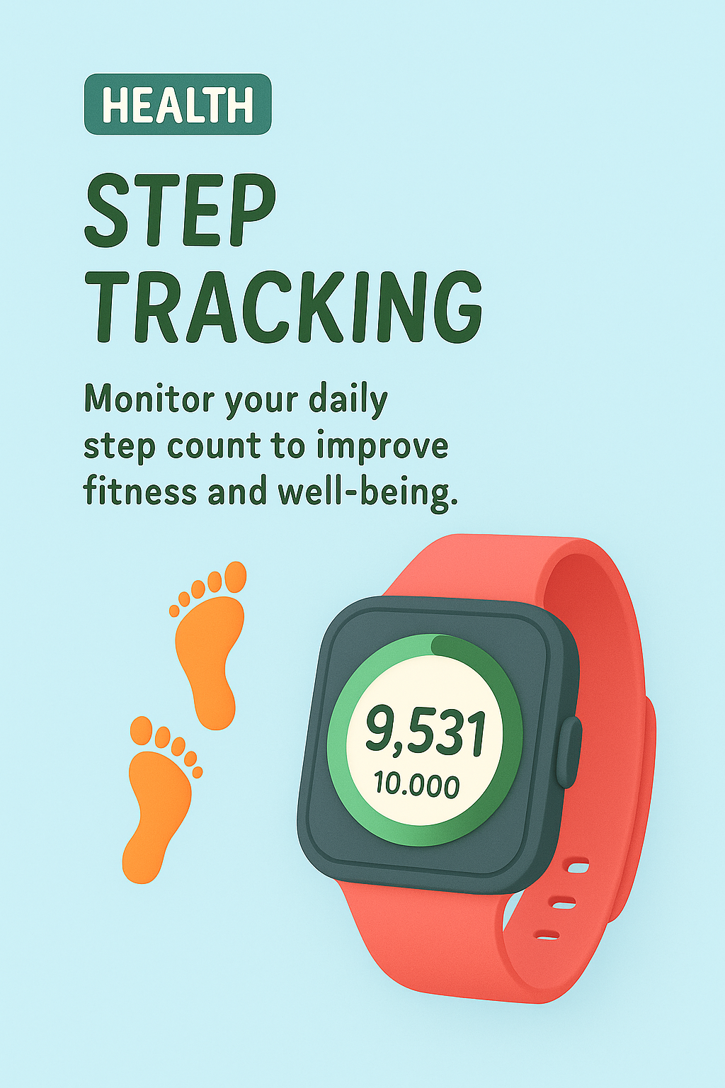 /Collection: /by davooda/Type: PNG/A colorful illustration promoting step tracking for health improvement, featuring a smartwatch and playful design elements, ideal for wellness apps or fitness campaigns.