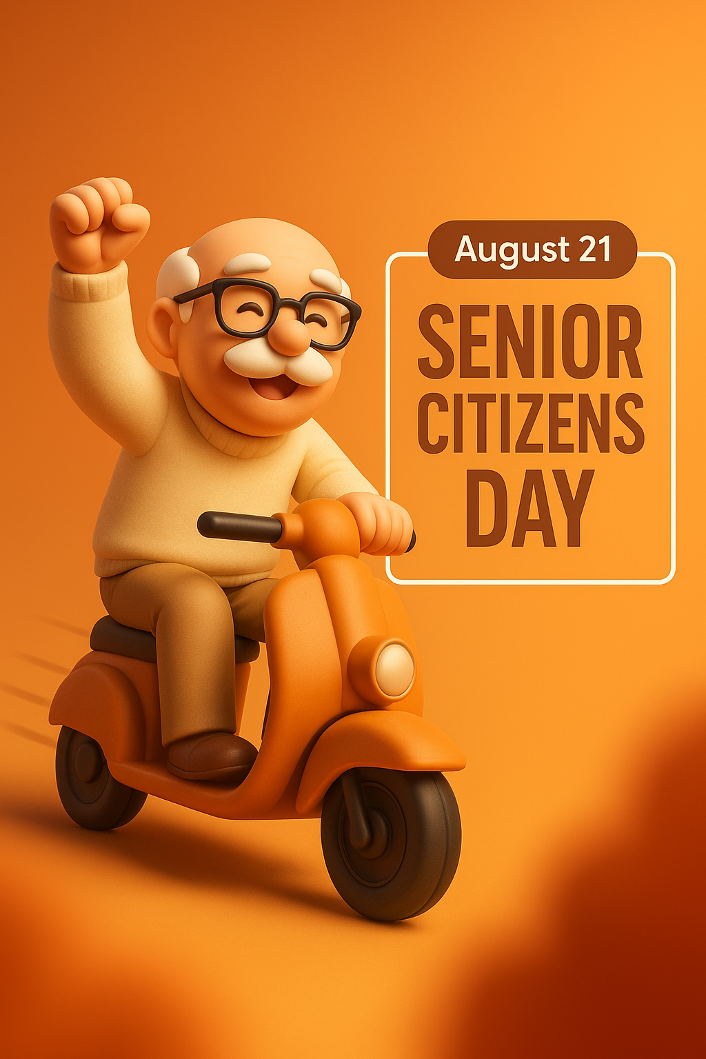 /Collection: /by davooda/Type: PNG/A colorful 3D illustration featuring a joyful elderly man riding a scooter, celebrating Senior Citizens Day. The vibrant orange background enhances the festive theme, making it suitable for social media posts or event promotions.
