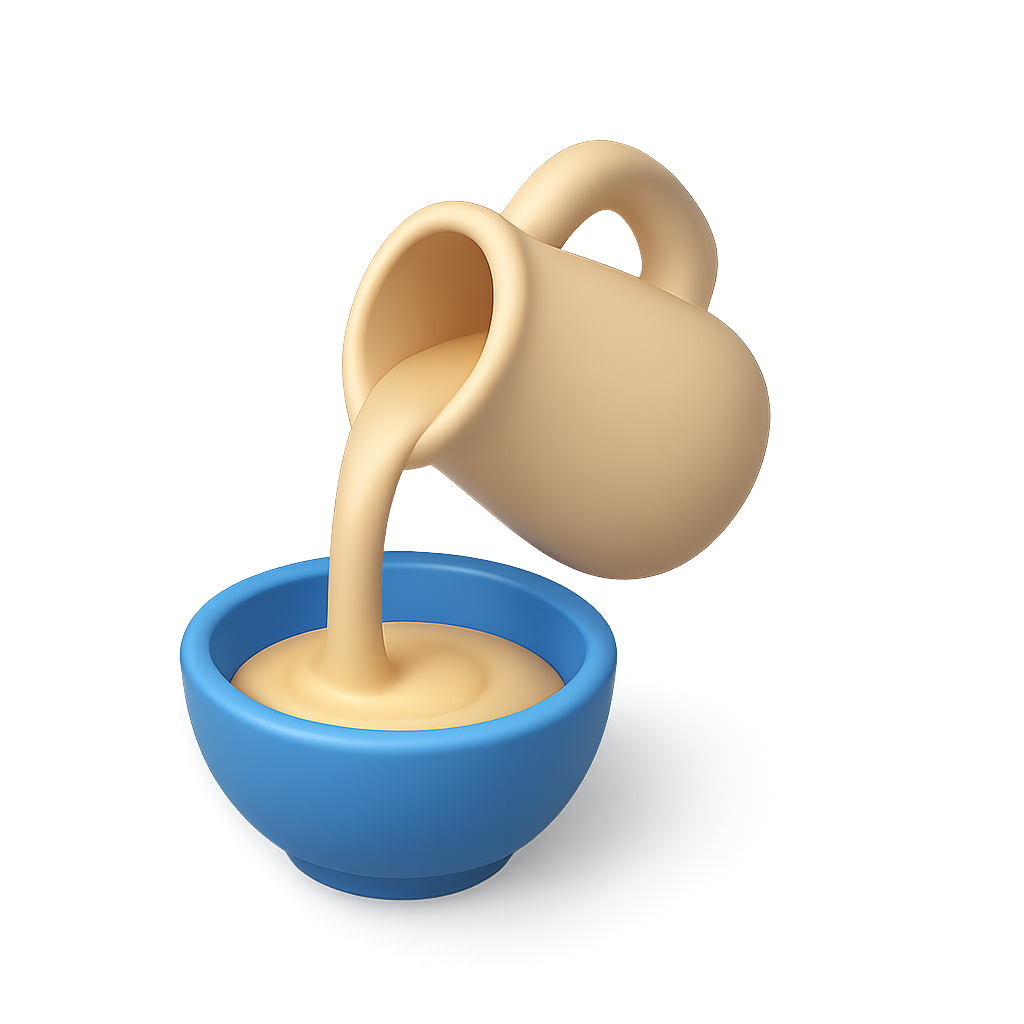 /Collection: /by davooda/Type: PNG/This image features a 3D icon depicting a liquid being poured from a beige jug into a blue bowl. The design has a transparent background and a three-quarter isometric perspective, showcasing a volumetric effect.
