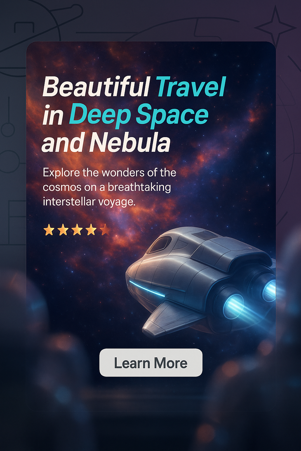 Visually striking promotional graphic featuring a futuristic spacecraft amidst a cosmic nebula, designed for travel enthusiasts interested in space exploration.