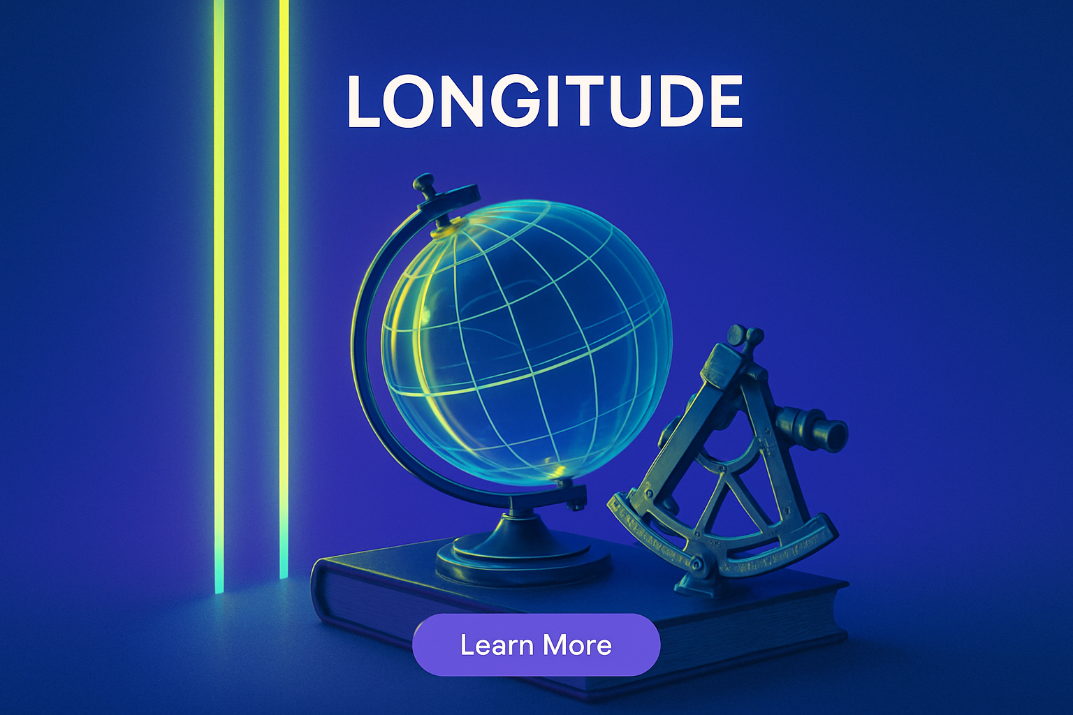 A captivating scene featuring a glowing globe and sextant, surrounded by neon stripes. The composition emphasizes longitude with a mix of light yellow-green and solid blue, creating a striking visual atmosphere.