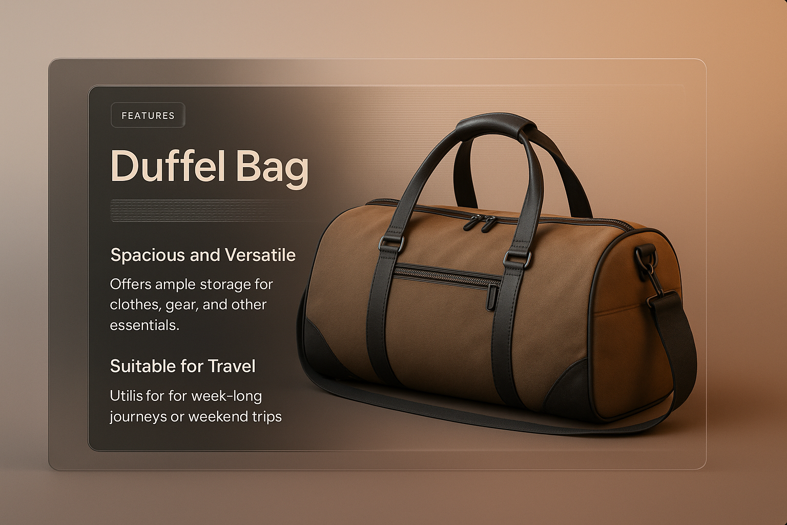 A modern 3D illustration of a duffel bag featuring a sleek design. The bag is shown with a dark background and an informative overlay detailing its spaciousness and versatility for travel.