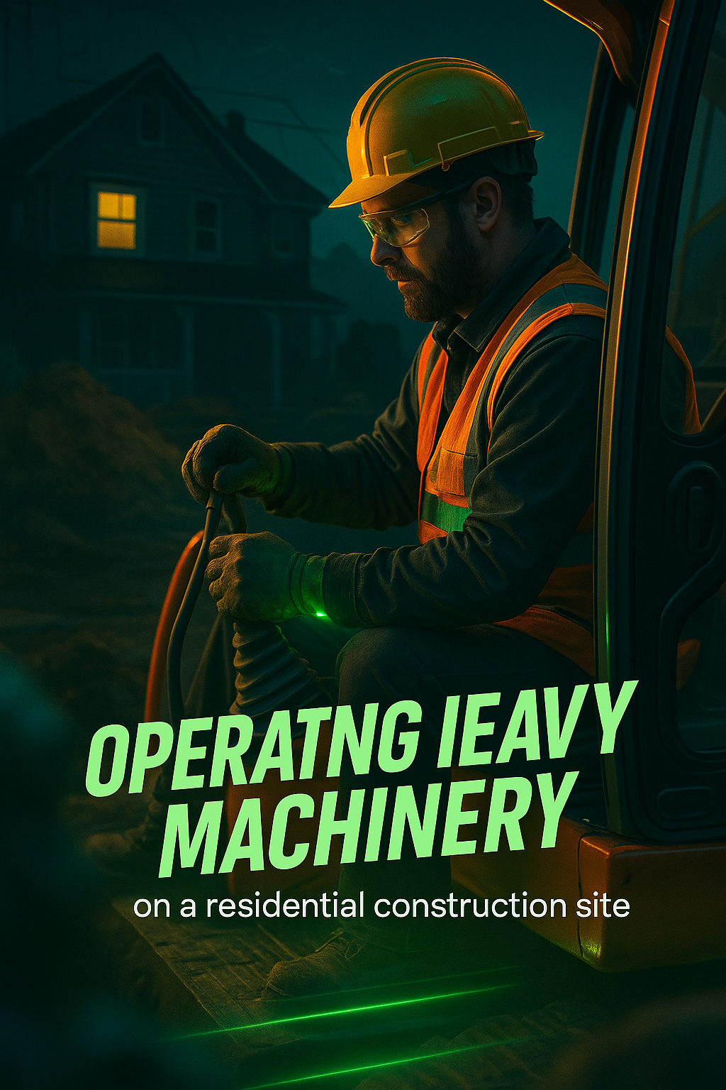 /Collection: /by davooda/Type: PNG/A visually engaging image of a construction worker operating heavy machinery at a residential site during dusk. The use of dramatic lighting and focus highlights the worker's concentration, making it suitable for industry-related content.