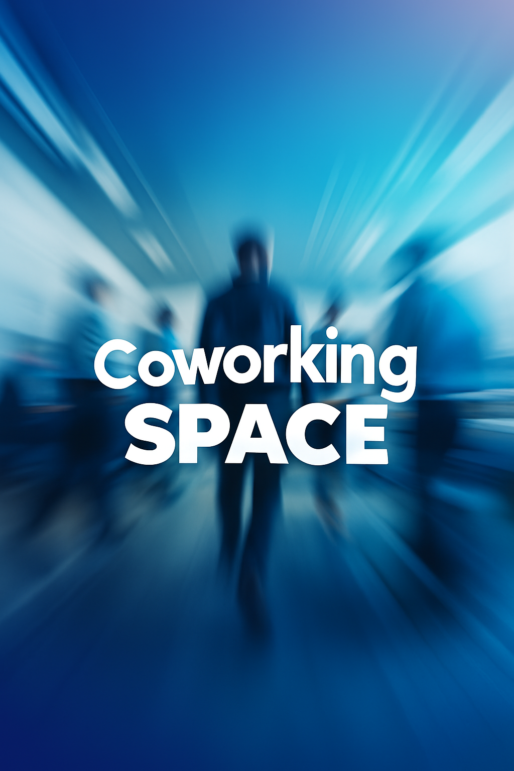 An artistic representation of blurred silhouettes in a coworking space, conveying a sense of motion and activity. The vibrant gradient background enhances the dynamic atmosphere.