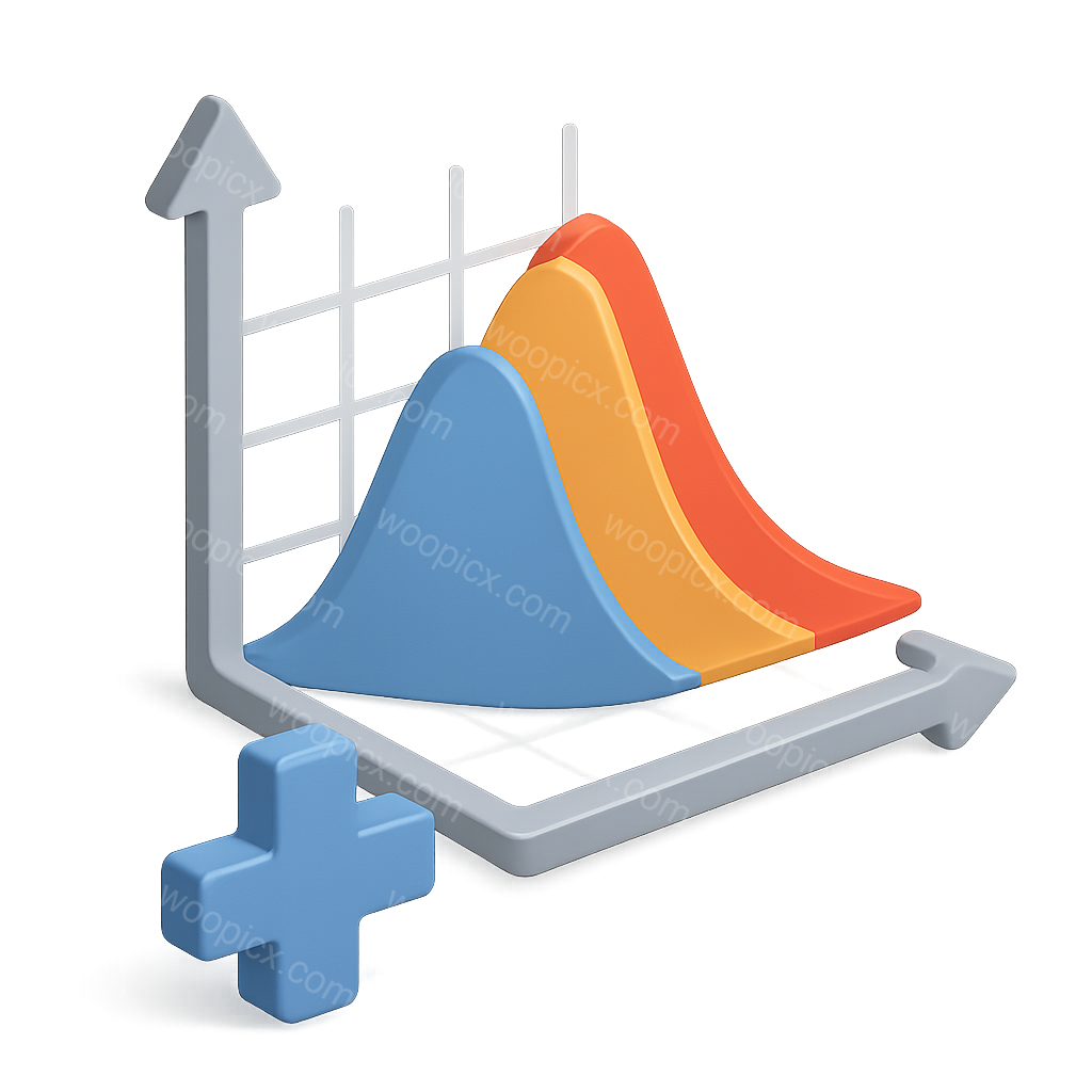 A visually engaging 3D graph depicting probability distributions with vibrant orange, yellow, and blue curves. The graph features axes and a plus sign, giving it a modern isometric feel.