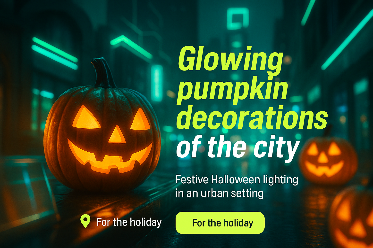 A vibrant Halloween-themed image showcasing glowing pumpkin decorations in an urban setting, evoking a festive atmosphere perfect for holiday promotions.