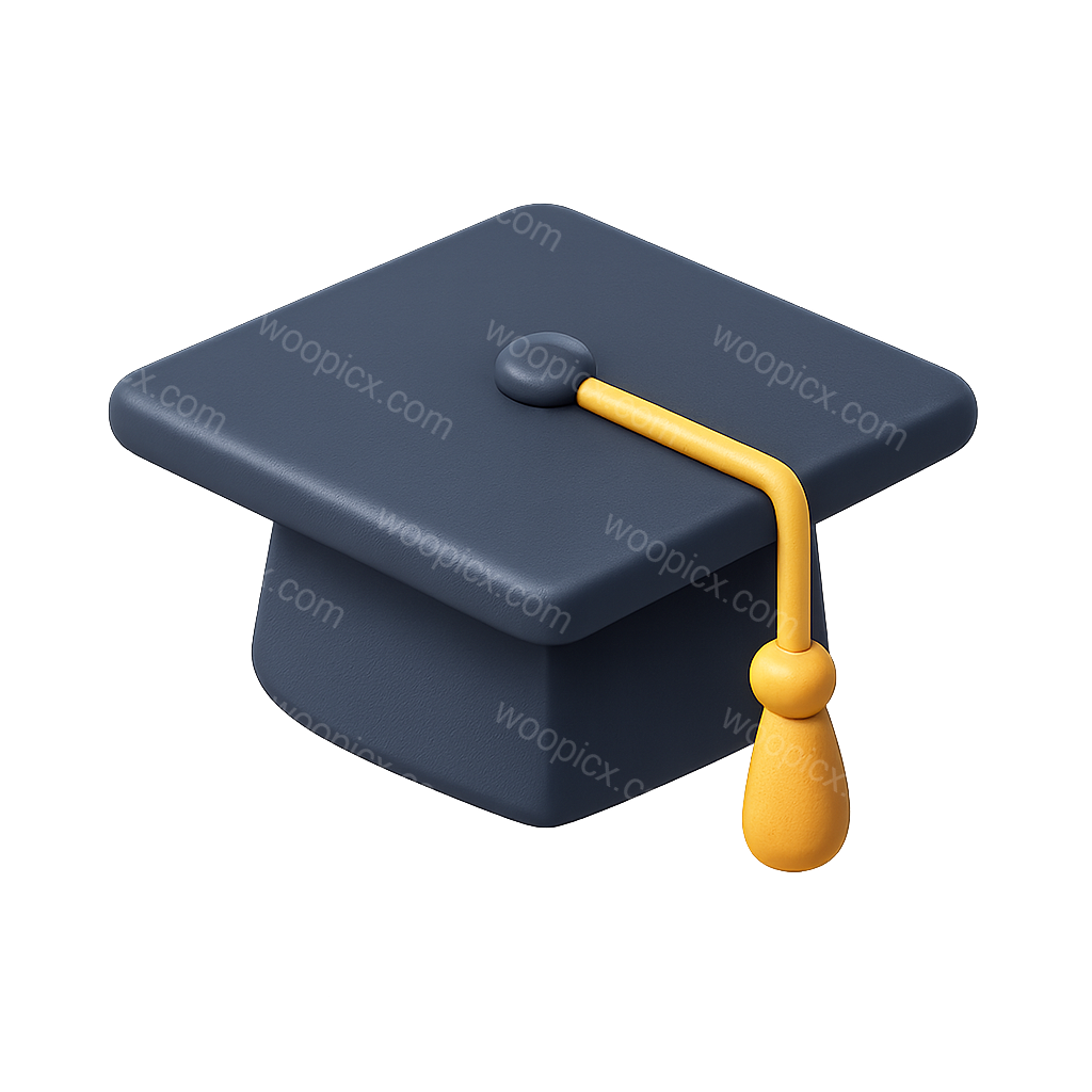 A sleek 3D graduation cap icon presented in a three-quarter view. The cap features a dark blue color with a bright yellow tassel, showcasing a modern and volumetric design.