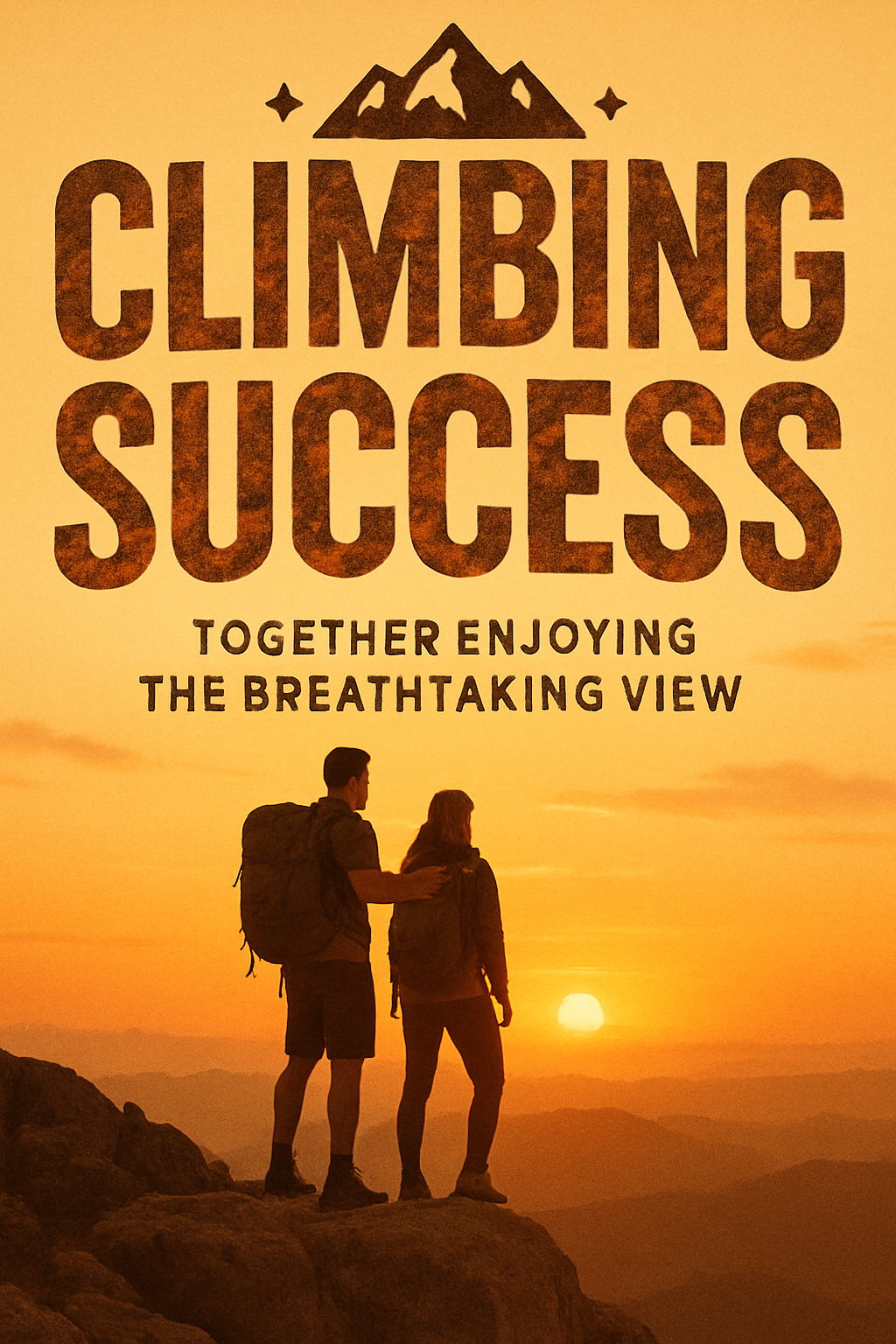 A motivational poster featuring a couple enjoying a sunset view atop a mountain, perfect for outdoor enthusiasts and adventure seekers.