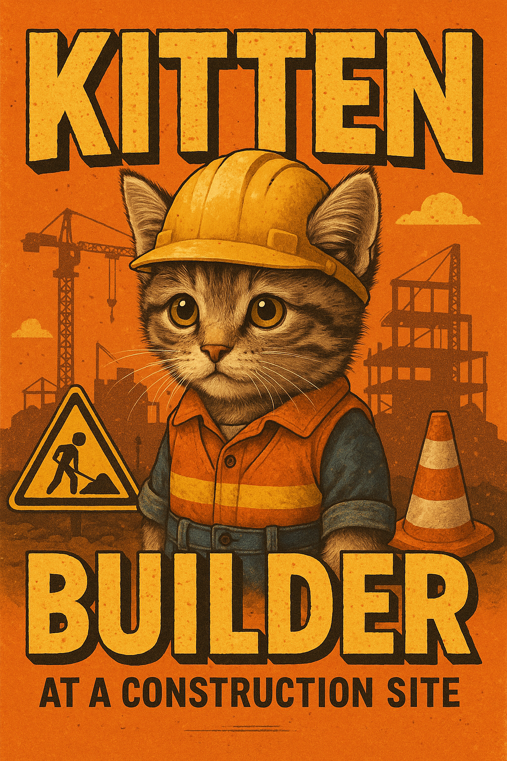 Whimsical Construction-Themed Graphic Featuring a Kitten