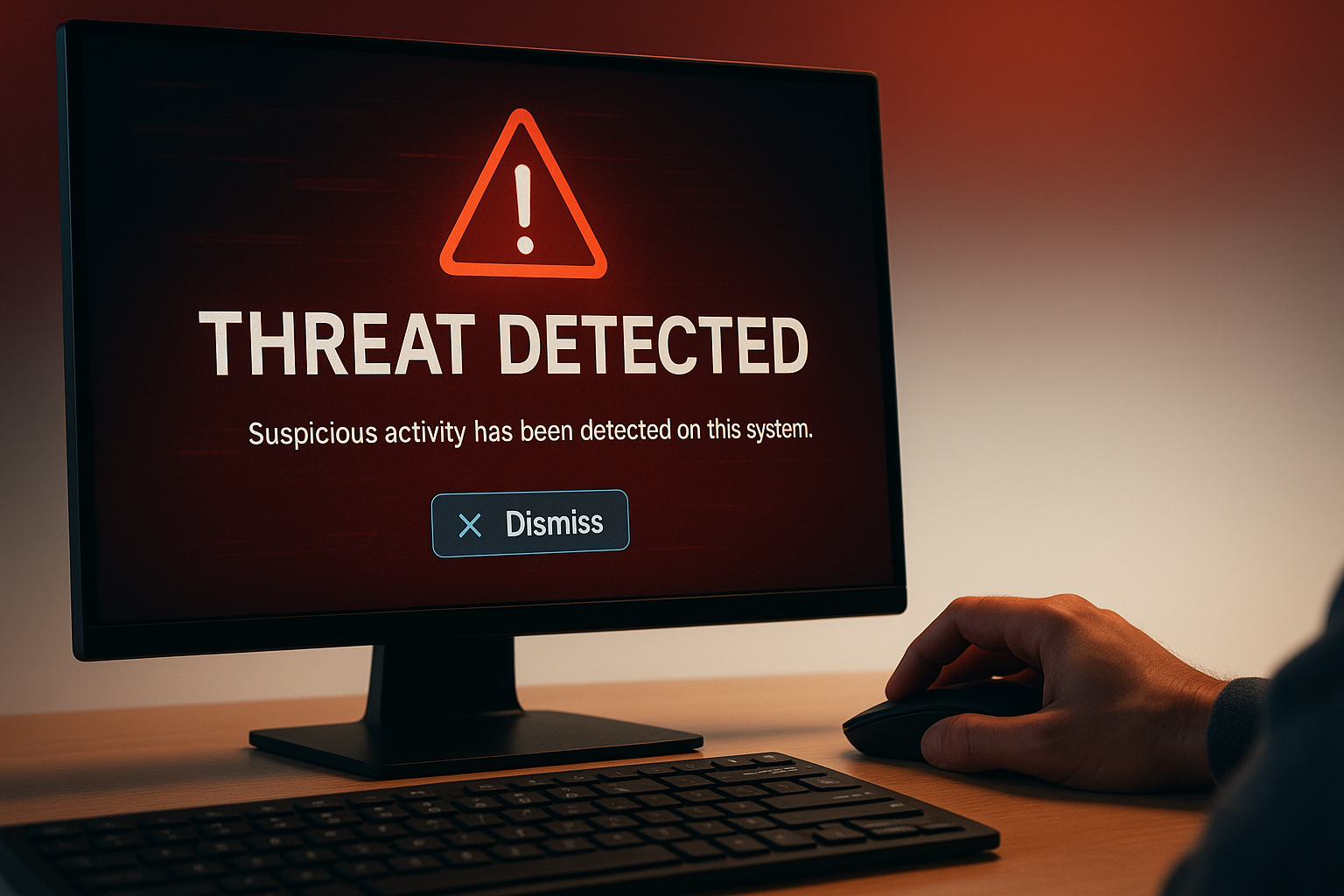 /Collection: /by davooda/Type: PNG/A modern computer screen displays a 'Threat Detected' alert with a warning icon. The background is a gradient transitioning from dark red to white, enhancing the urgency of the message.