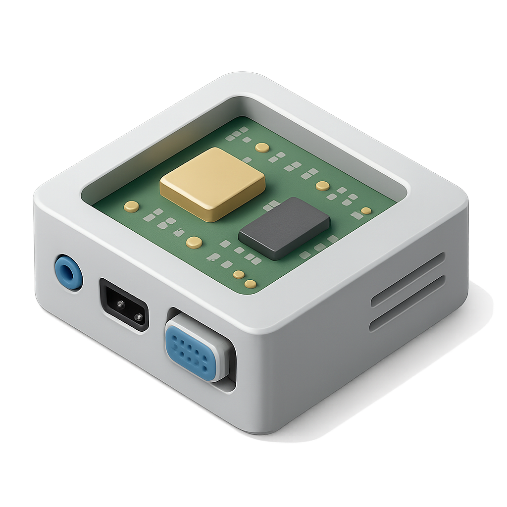 A sleek 3D icon depicting an embedded computer with a transparent background. The design features a circuit board with various components in a three-quarter isometric view.