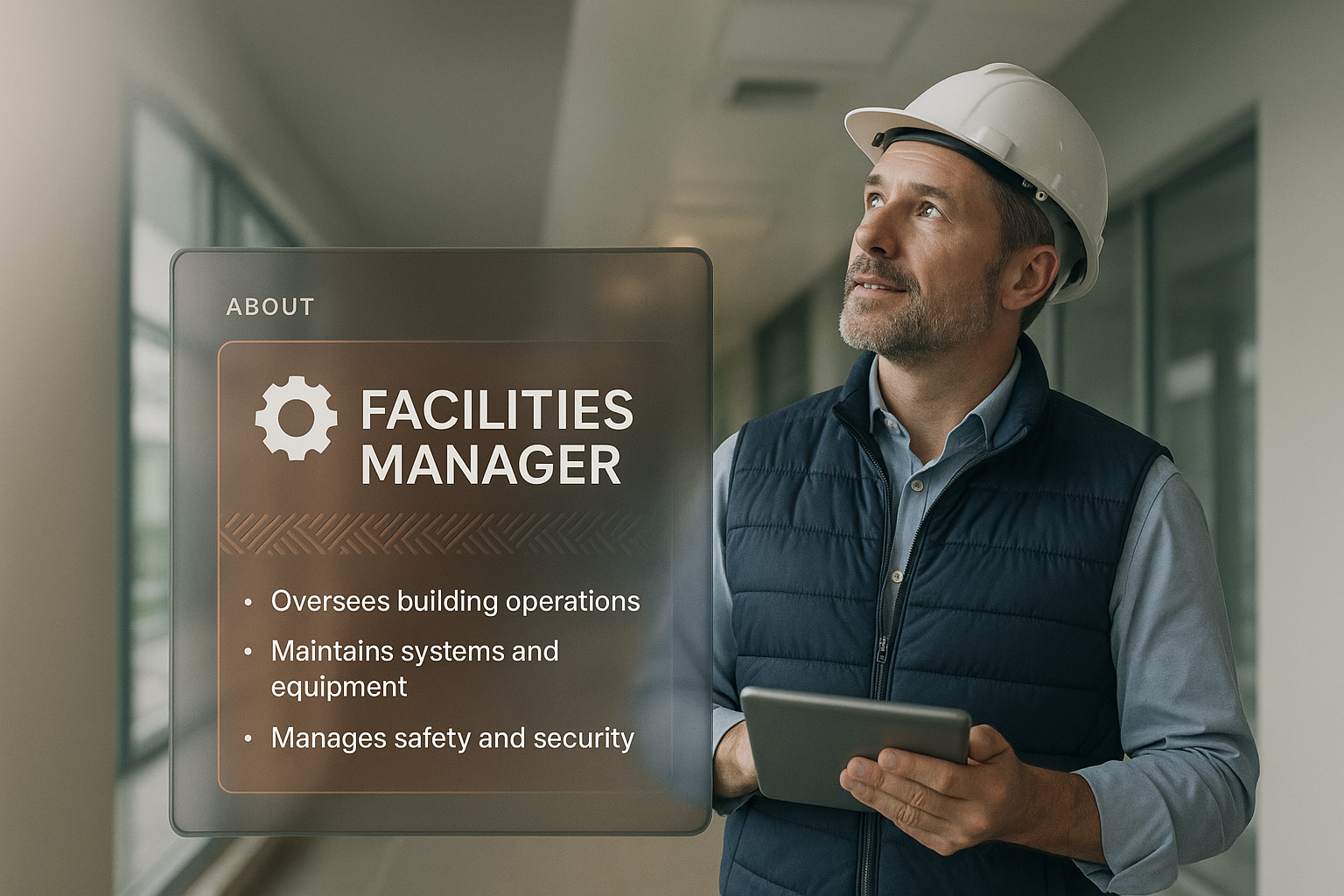 A bright web page design featuring a facilities manager holding a tablet. The layout includes integrated text blocks with icons, providing a clean, professional look.