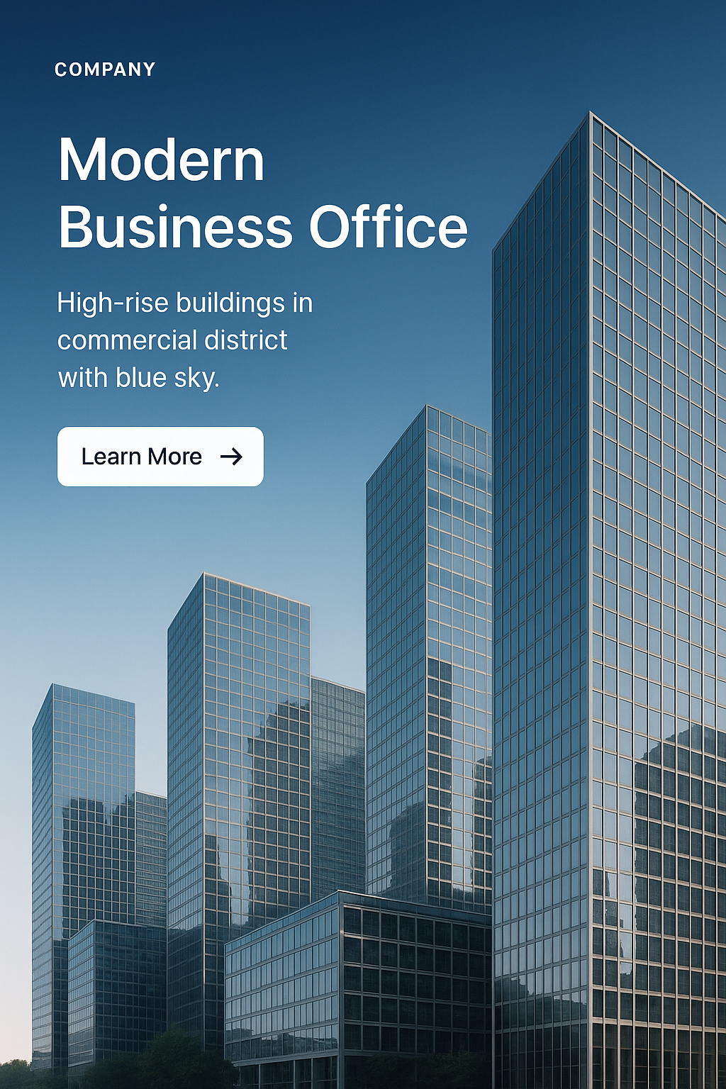/Collection: /by davooda/Type: PNG/A stunning view of modern skyscrapers highlighting sleek glass facades in a commercial district under a clear blue sky. The image embodies a high-tech office environment.