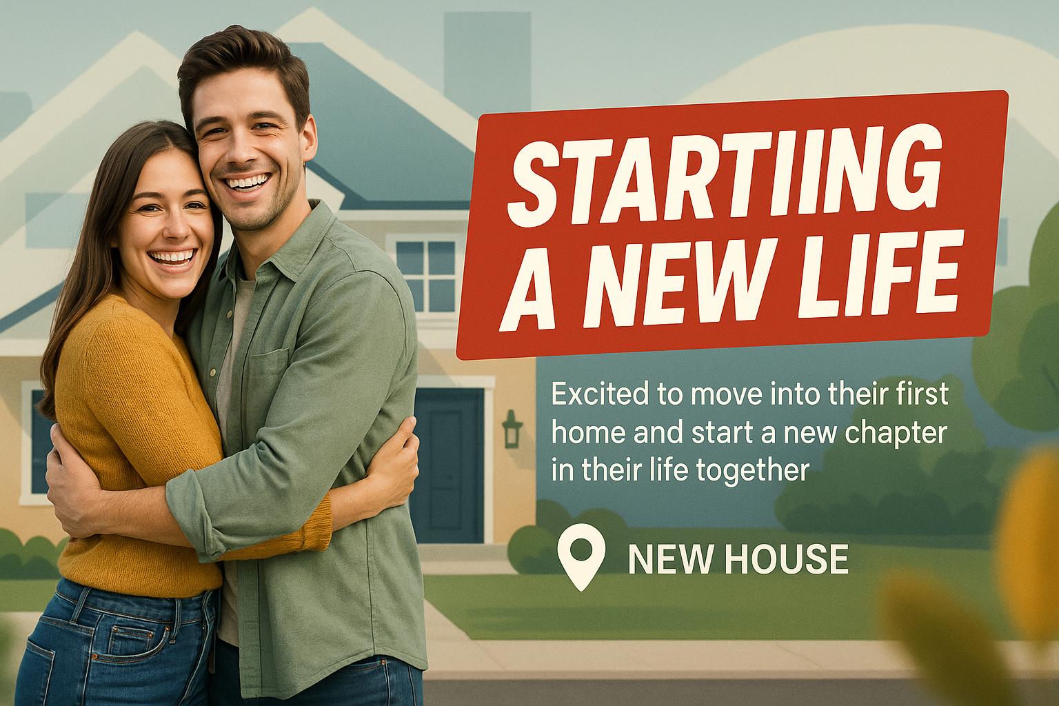 A vibrant social media post illustrating a joyful couple embracing outside their new house, symbolizing new beginnings and homeownership. Ideal for real estate marketing or lifestyle content.