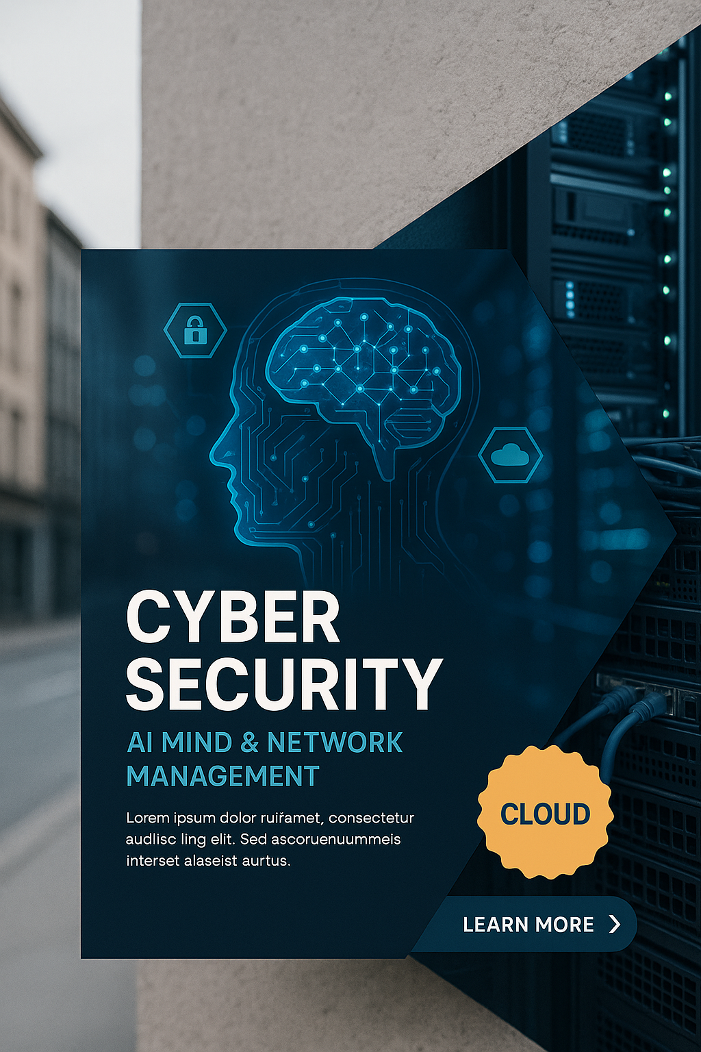 A visually striking design featuring a head silhouette with network connections, emphasizing themes of cyber security and AI. The layout includes contrasting colors and a clear action button.