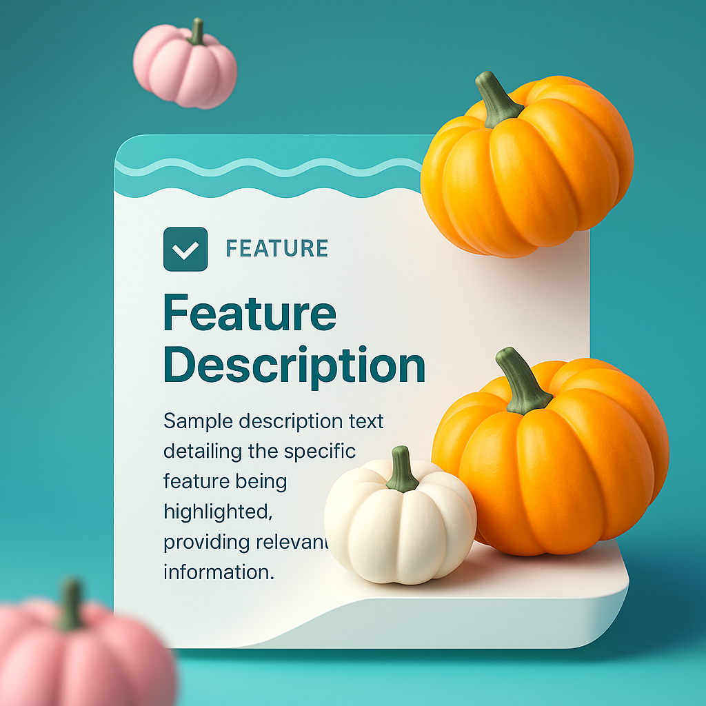 /Collection: /by davooda/Type: PNG/A visually appealing composition featuring small orange, white, and pink pumpkins on a pastel blue background. There is a modern feature description box integrated into the design, enhancing the overall aesthetic.