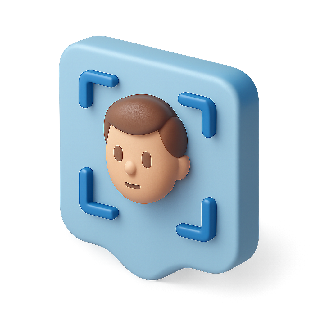 A 3D icon representing face recognition technology, featuring a stylized human face in a three-quarter view, set against a soft gradient background.