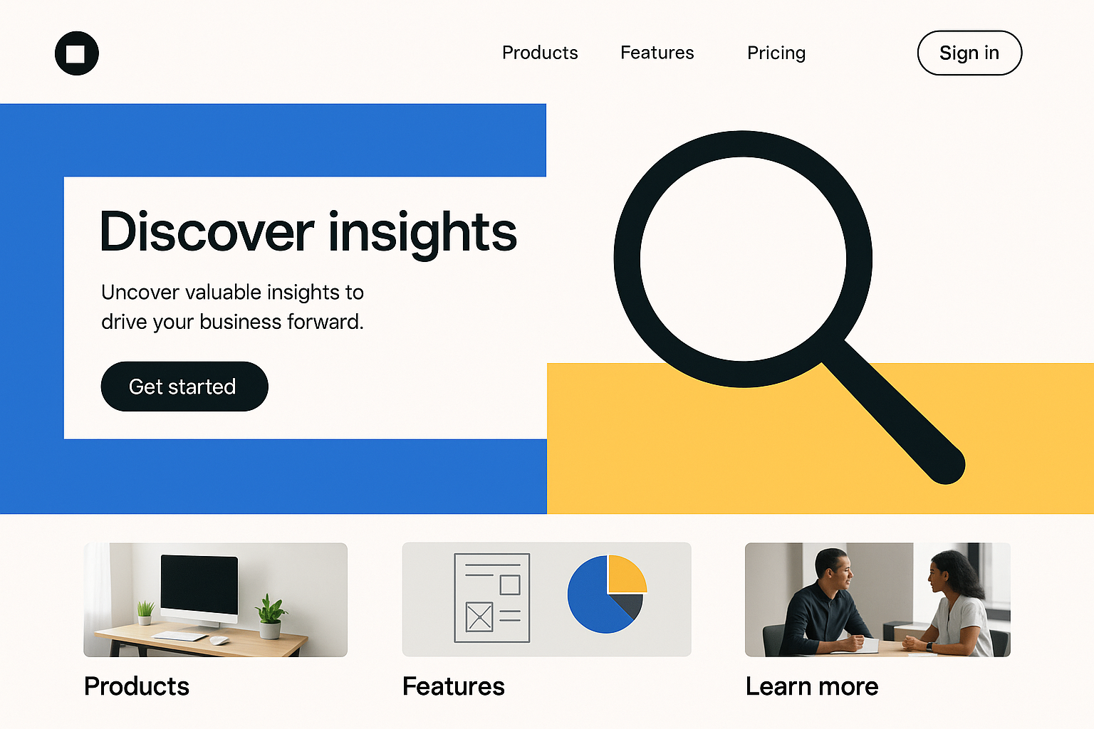 /Collection: /by davooda/Type: PNG/A sleek and modern landing page design featuring a large search magnifier. The layout is structured with distinct color blocks, showcasing 'Products', 'Features', and 'Pricing' sections with simple visuals.