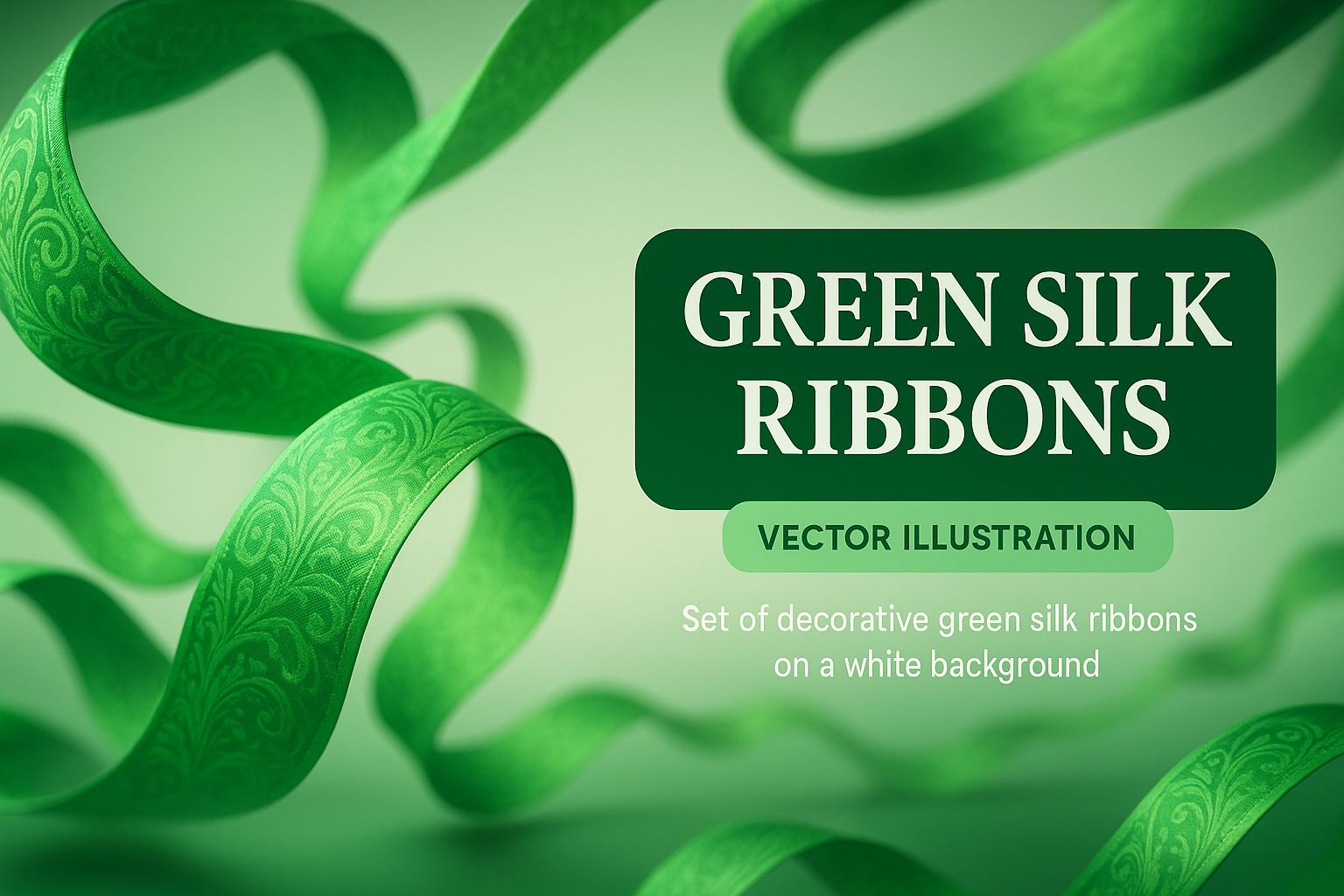 High-quality vector illustration of decorative green silk ribbons, designed with intricate patterns, ideal for packaging, greeting cards, or festive designs.