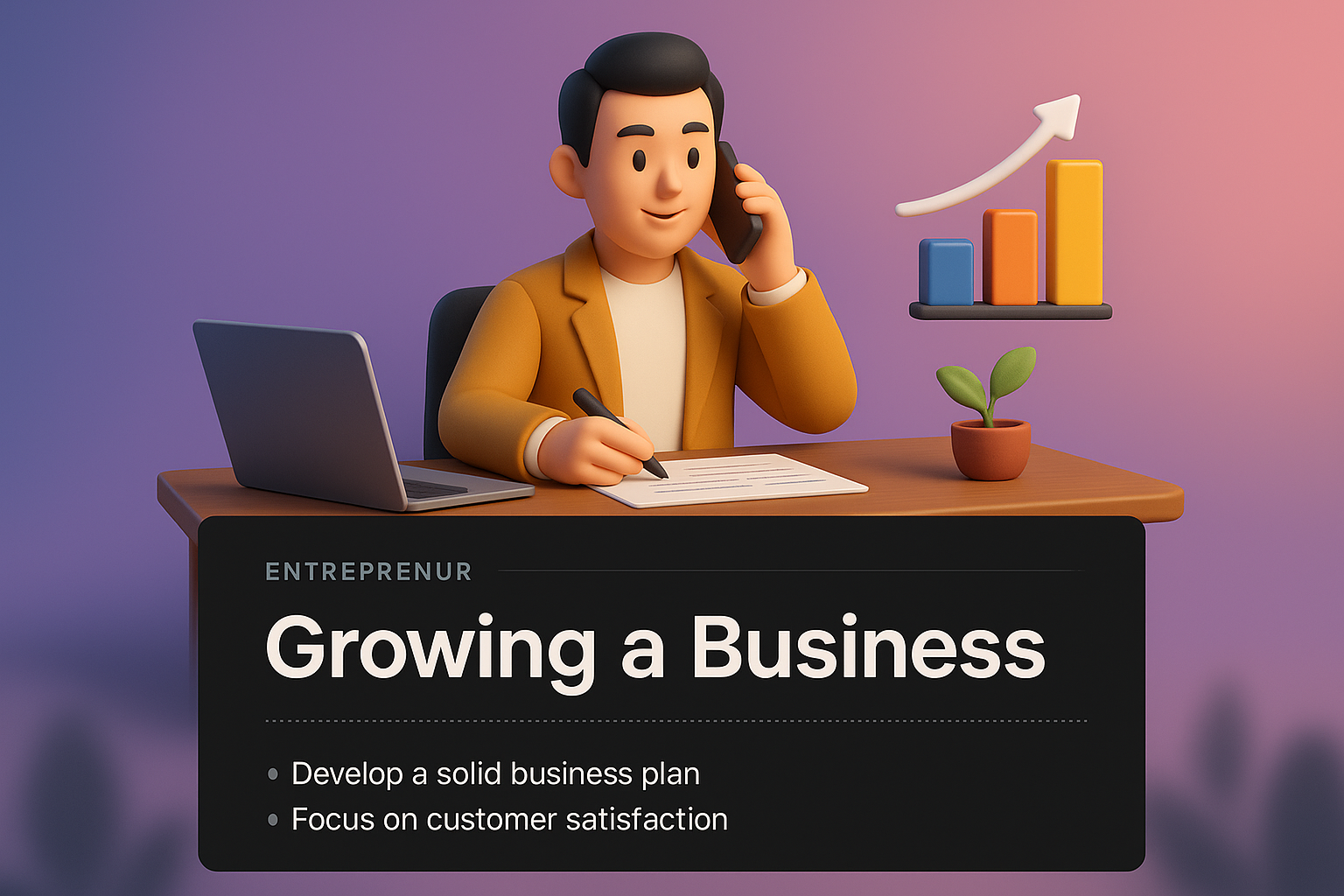 /Collection: /by davooda/Type: PNG/A vibrant 3D scene featuring an entrepreneur on a phone at a desk, with growth charts and a plant. The design integrates a dark panel showcasing key business growth points.